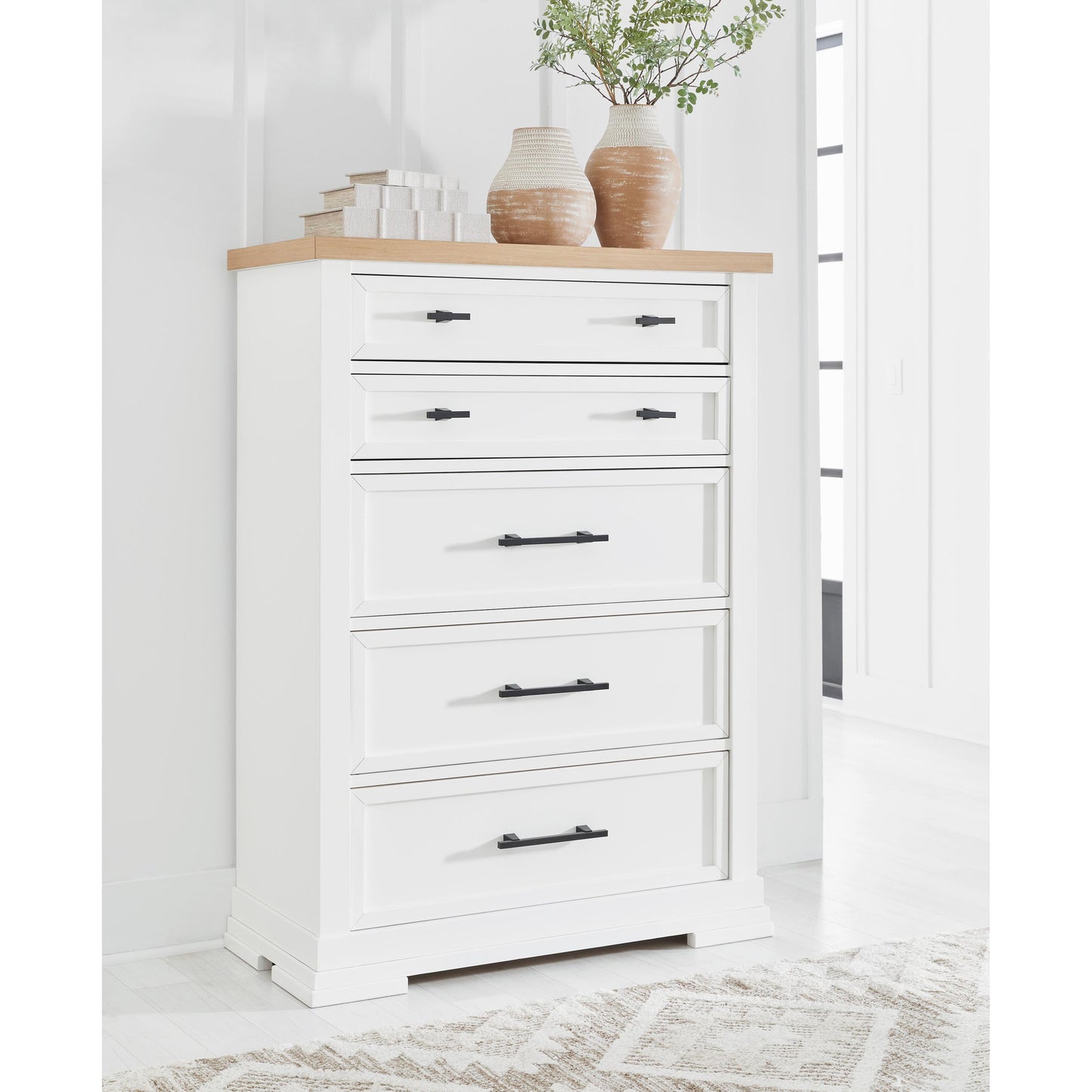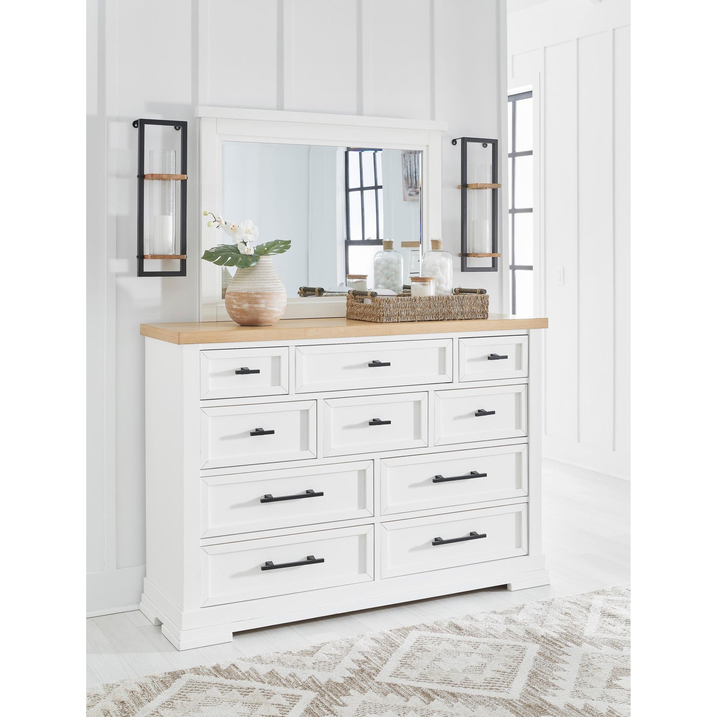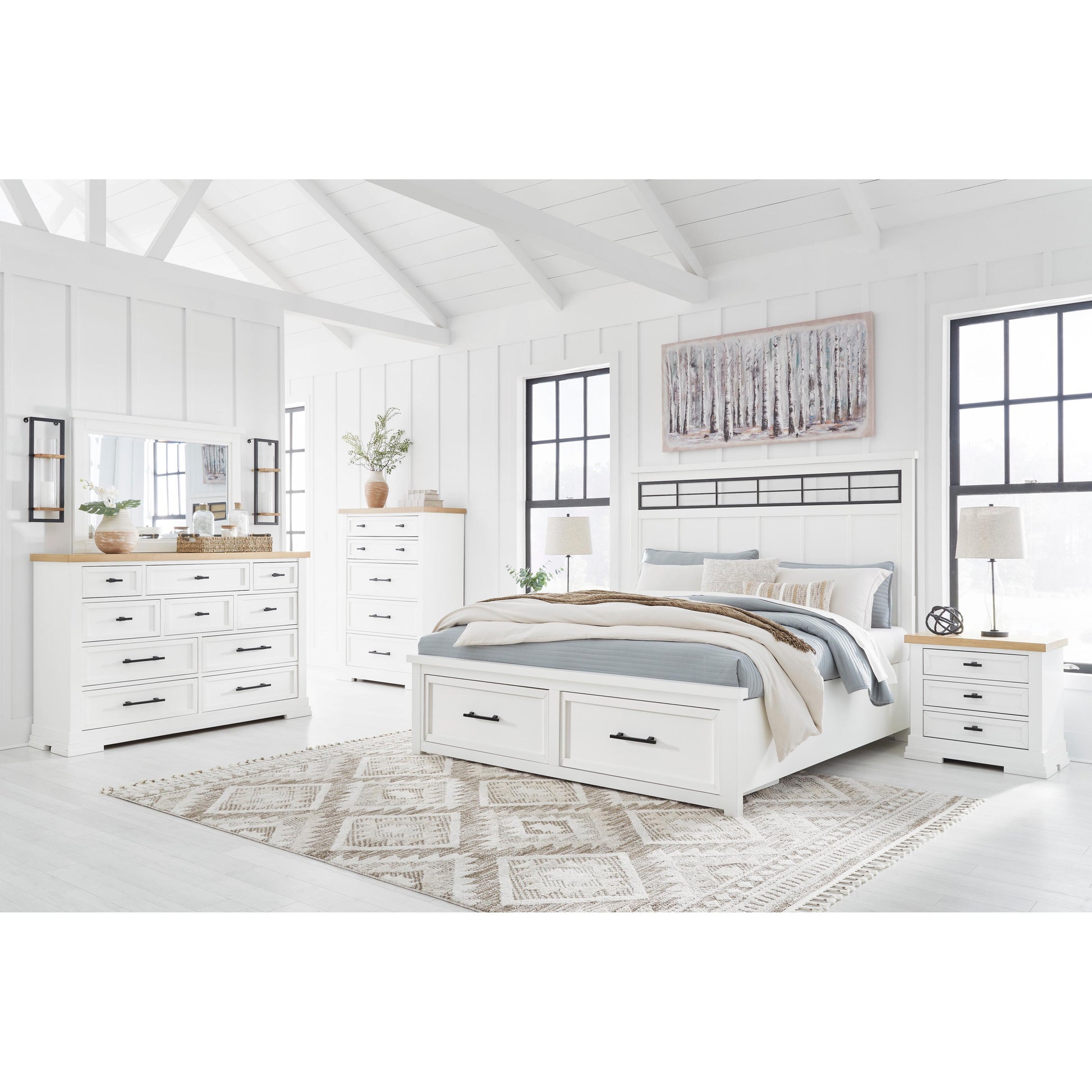 This Ashbryn 8-piece queen panel bedroom set delivers casual style with substance. A sturdy collection with a classic white finish and black metal hardware exudes modern farmhouse vibes. Storage drawers are spacious enough for all your essentials. This set includes a queen panel headboard, footboard, rails, dresser, mirror, chest, and 2 nightstands.