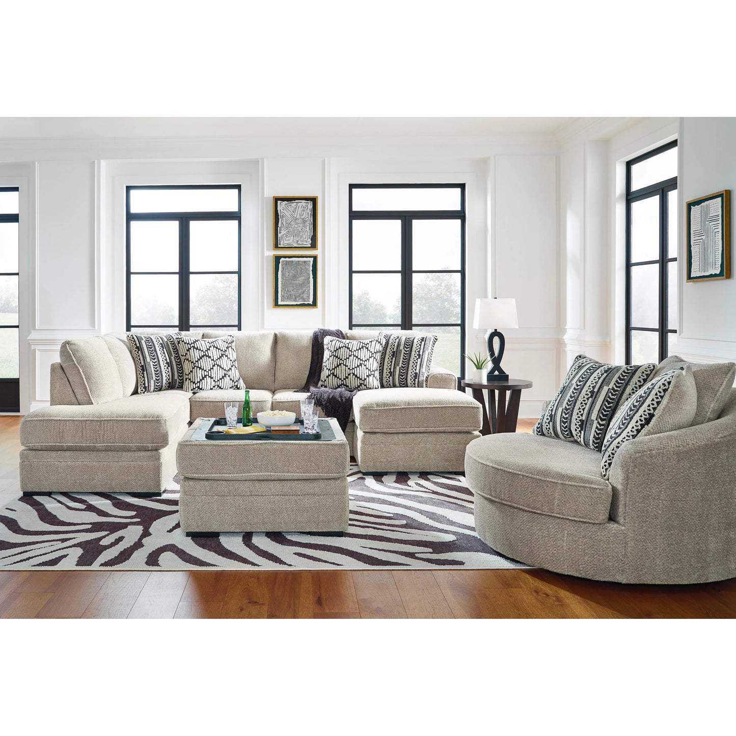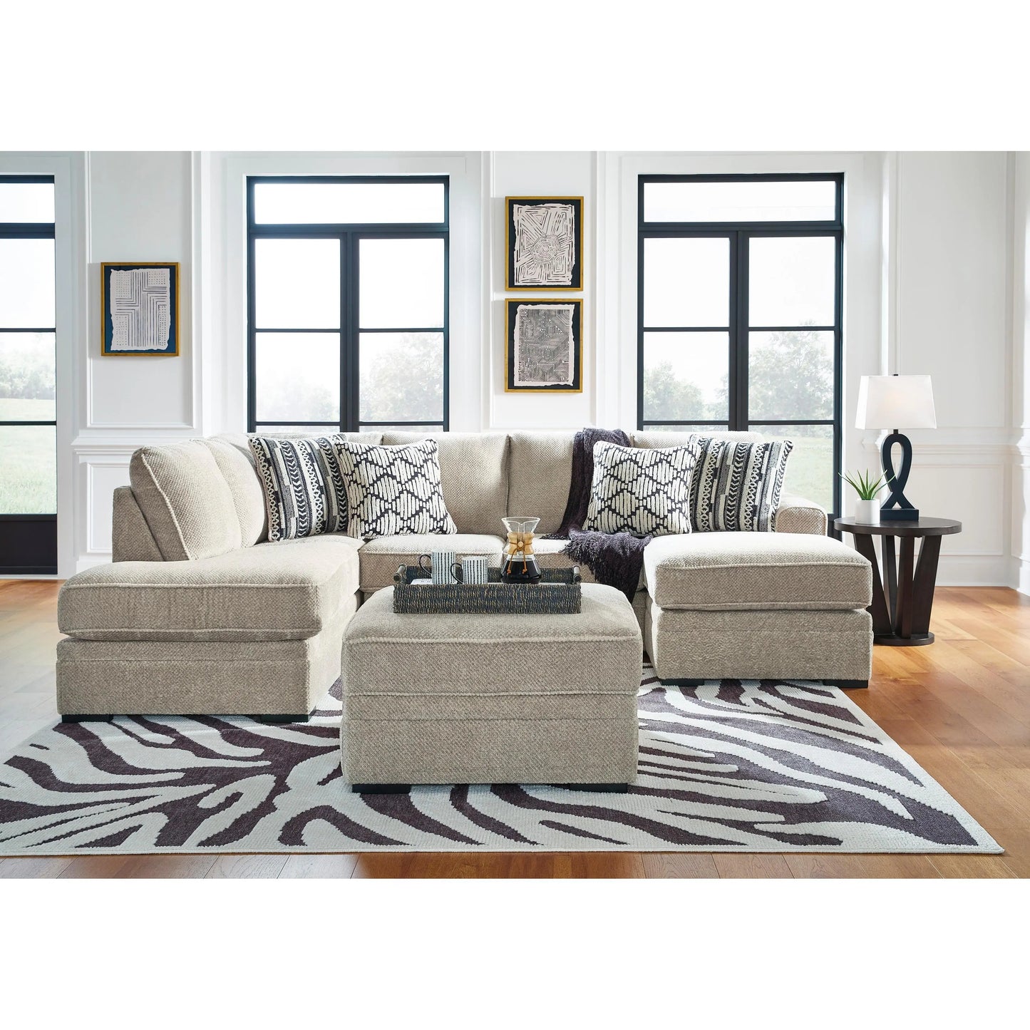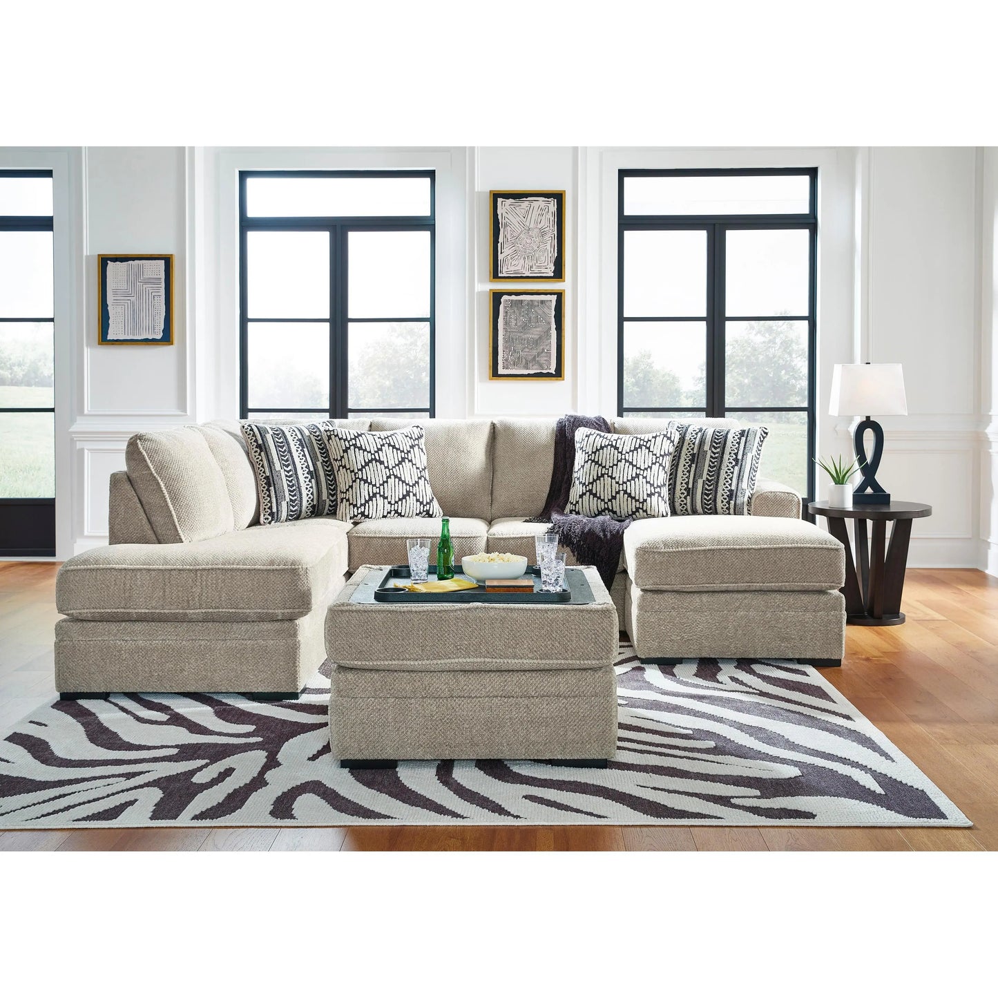 This sectional caters to your need for contemporary comfort. It’s decked out in feel-good fabric in a versatile hue. Family-friendly and ideal for hosts with the most, two chaises give more people the space the sprawl out. Quality time has never been so cozy.