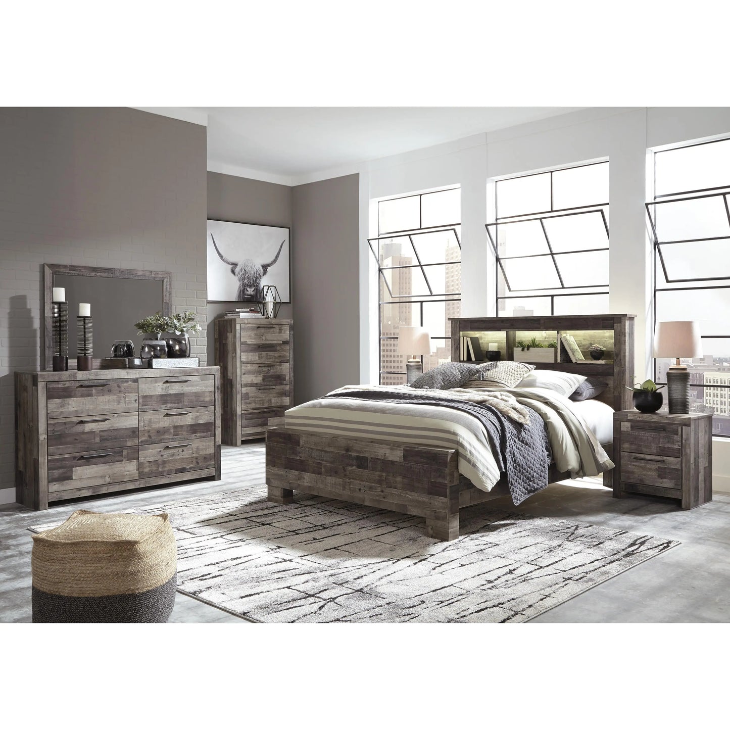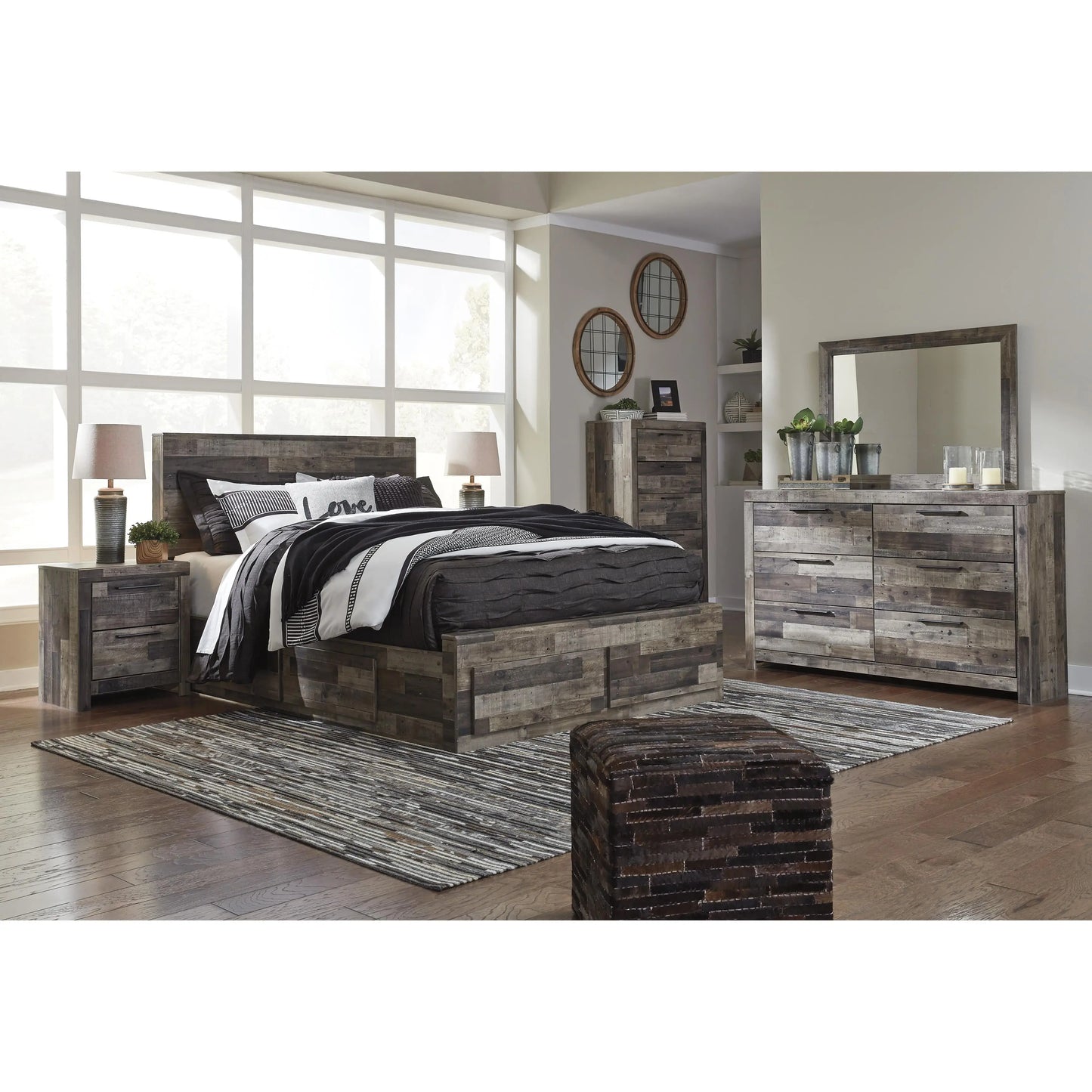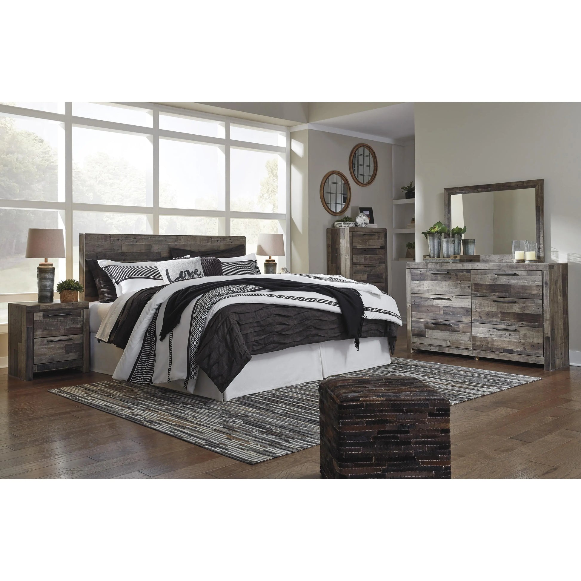 Modern yet hefty. This dresser and mirror set makes an urban eclectic statement. Seasoned raw wood look merges with the clean lined design we love today. Muted rustic finish over replicated pine grain maintains its authenticity. Roomy drawers are flanked with attractive framed front and pilasters. Handles with antiqued gunmetal finish complete this beauteous look with easy to pull function.