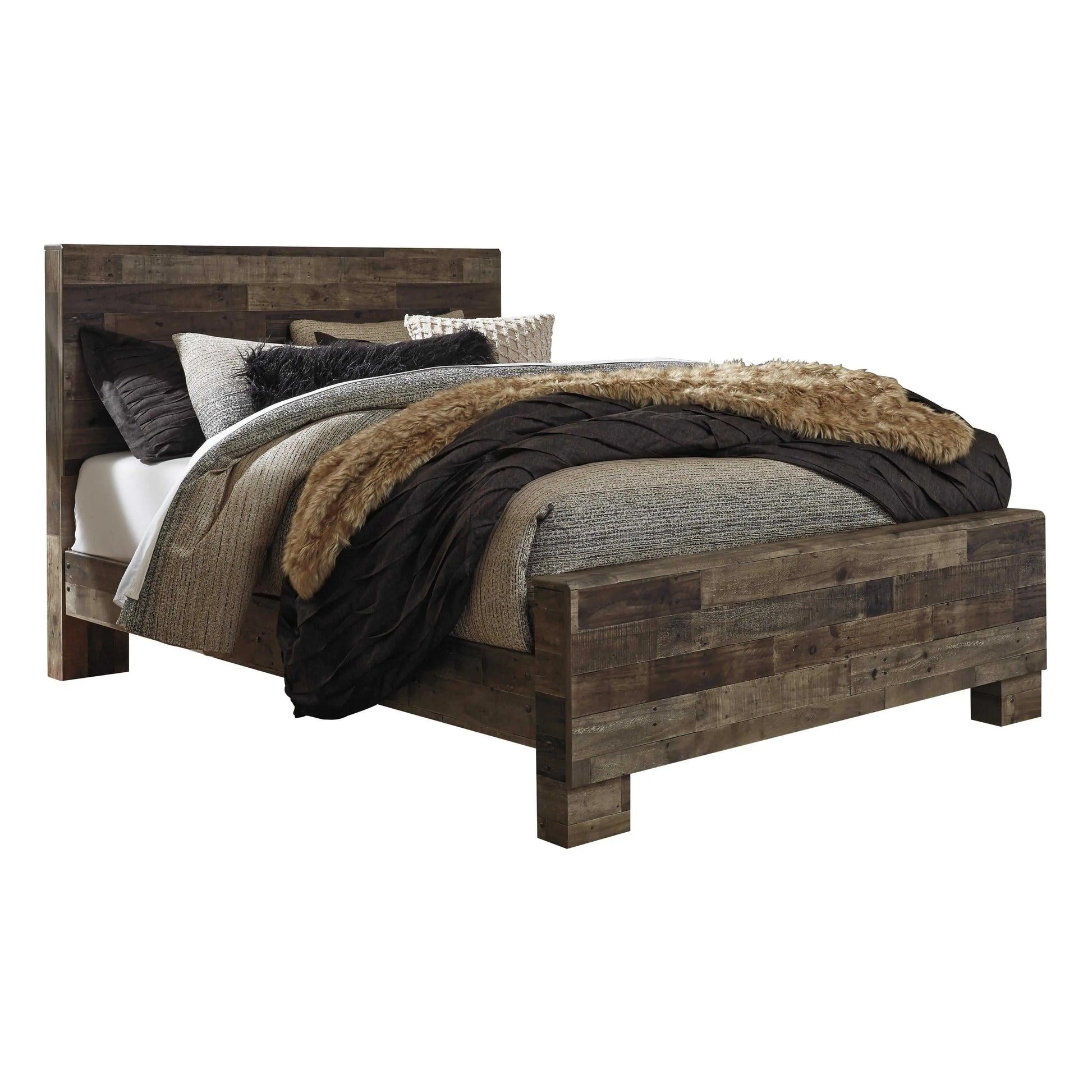 Modern yet hefty. This queen panel bed makes an urban eclectic statement. Seasoned raw wood look merges with the clean lined design we love today. Muted rustic finish over replicated pine grain maintains its authenticity for a beauteous look. Mattress and foundation/box spring available, sold separately.