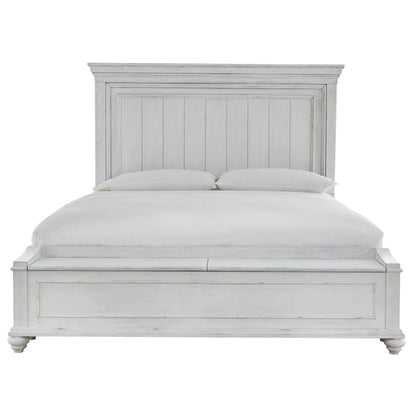 Give your retreat vintage charm with this queen panel bed and storage footboard. In a beautifully distressed whitewash finish, you'll love the headboard's grand style featuring a picture framed panel. The bench footboard is equally elegant offering extra storage and a convenient seat. Generously scaled moulding from top to bottom, along with bun feet give this bed character—evoking the feel of a quaint cottage escape.