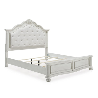 Transform your inner sanctum into a haven of timeless elegance. This traditionally inspired California king upholstered panel bed features a cushioned headboard embellished with a serpentine-shaped crown and light pearl gray upholstery. A contoured footboard with picture frame moulding completes the ageless aesthetic. And did we mention the classic antiqued white finish and stylish reeded bun feet? Talk about relaxed refinement.