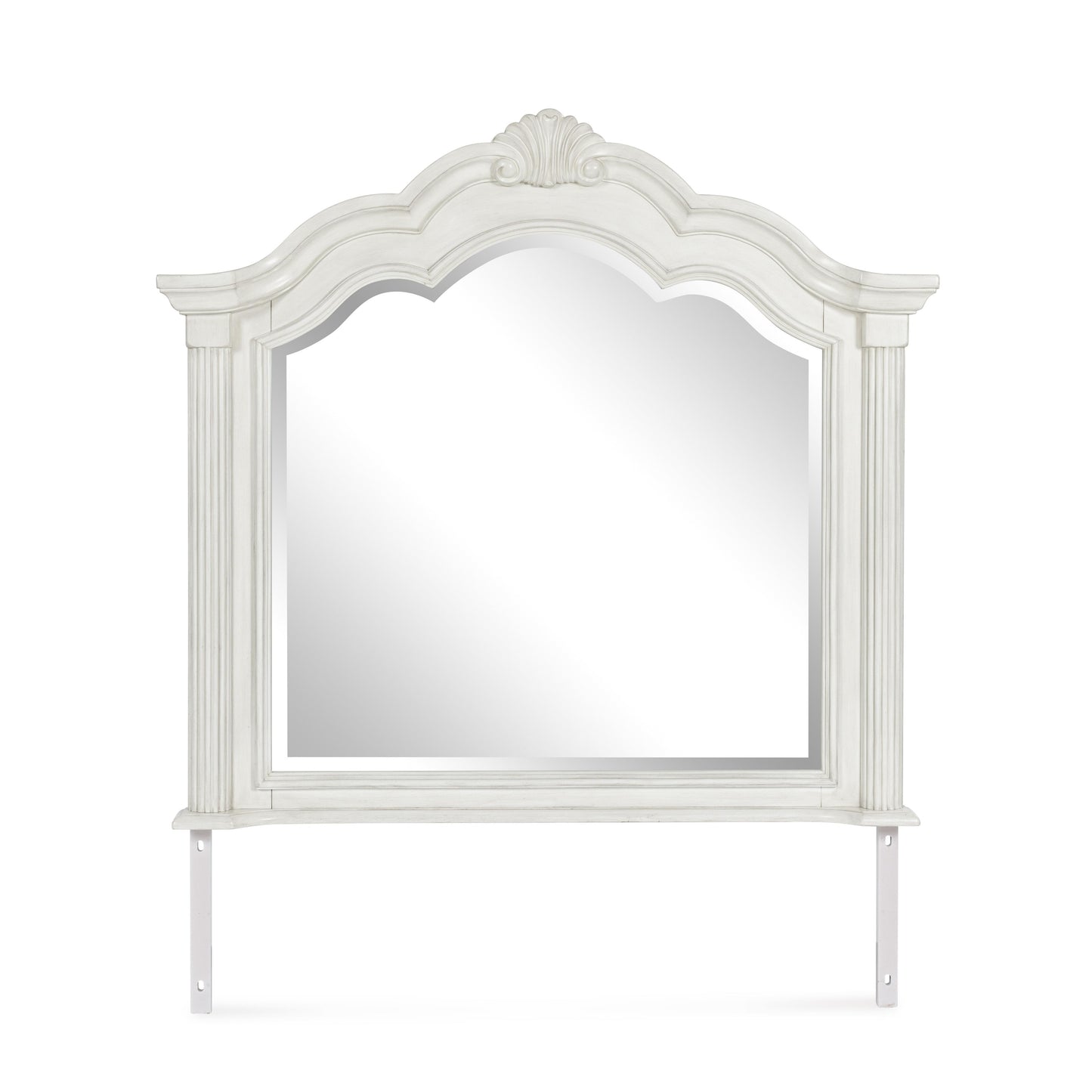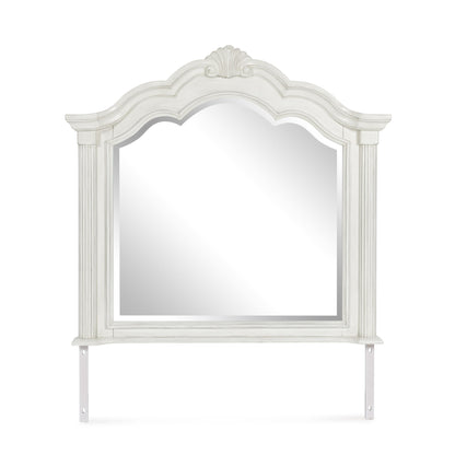 This bedroom mirror is made with hardwood solids and cast resin components. Pairs with other items in the series to make a dresser and mirror kit.