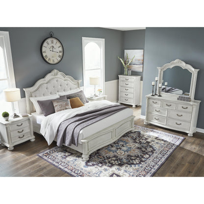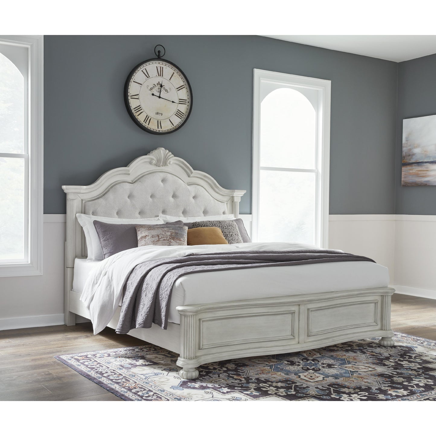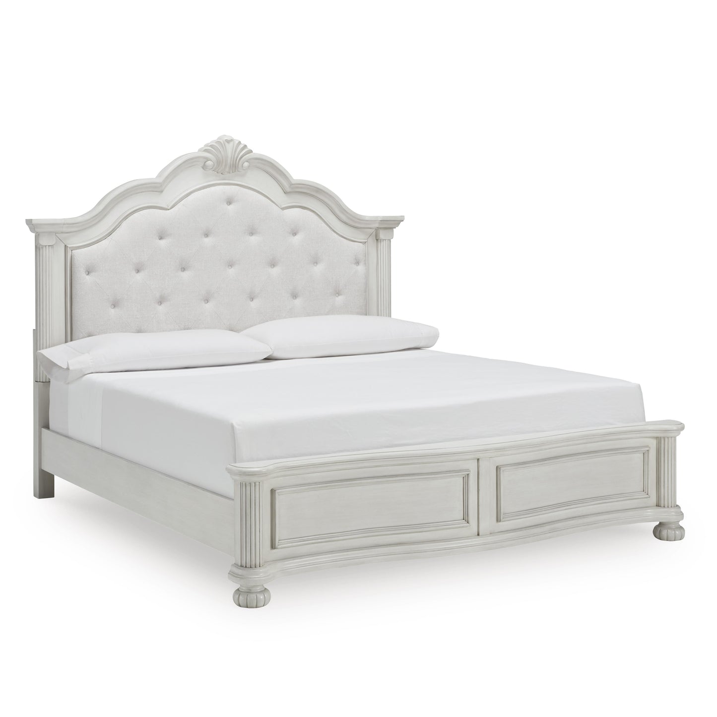Transform your inner sanctum into a haven of timeless elegance. This traditionally inspired queen upholstered panel bed features a cushioned headboard embellished with a serpentine-shaped crown and light pearl gray upholstery. A contoured footboard with picture frame moulding completes the ageless aesthetic. And did we mention the classic antiqued white finish and stylish reeded bun feet? Talk about relaxed refinement.