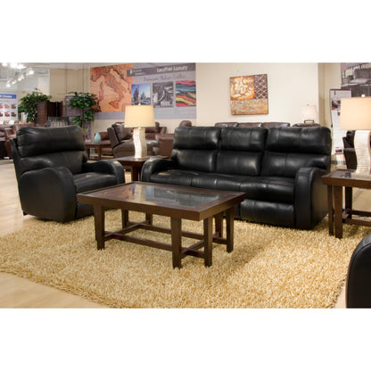 This gorgeous and comfortable Angelo Power Reclining Sofa is offered in black color leather match upholstery. It features pub-style backs, pad-over-chaise with footrest, rounded track arms. It is adorned with contrasting stitching accents.
