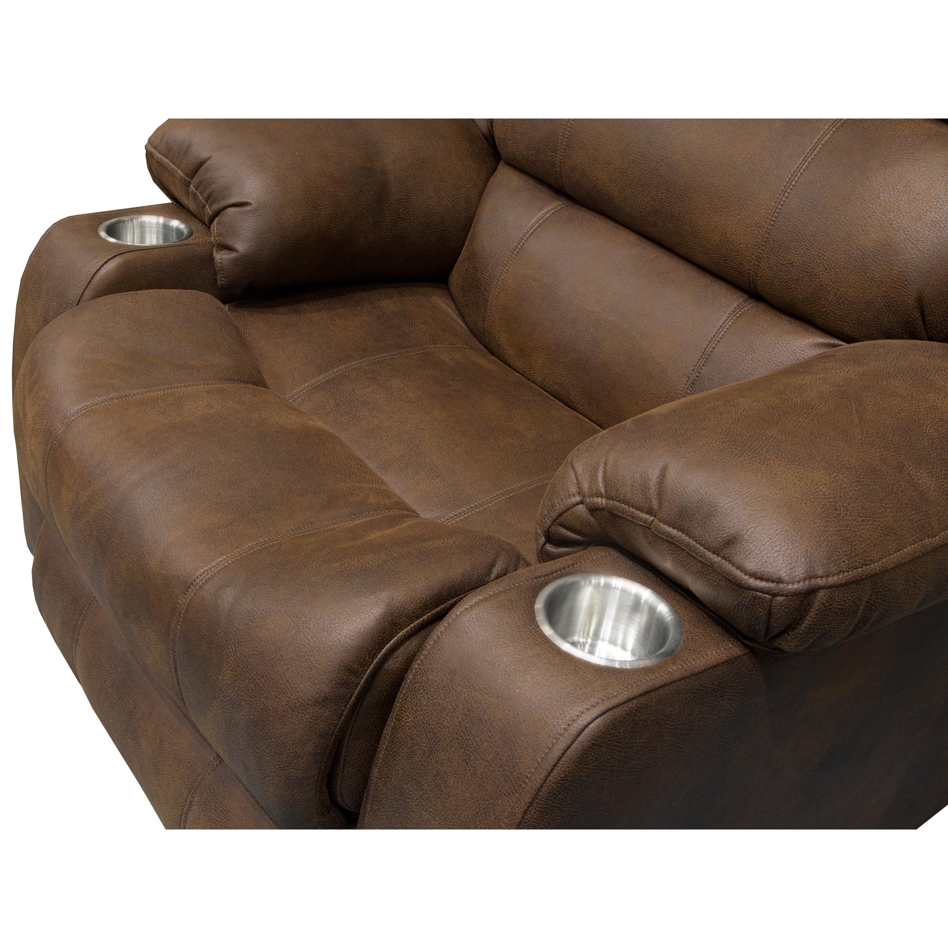 This Beckley rocker recliner features two cup holders, pillow arms, and walnut upholstery.