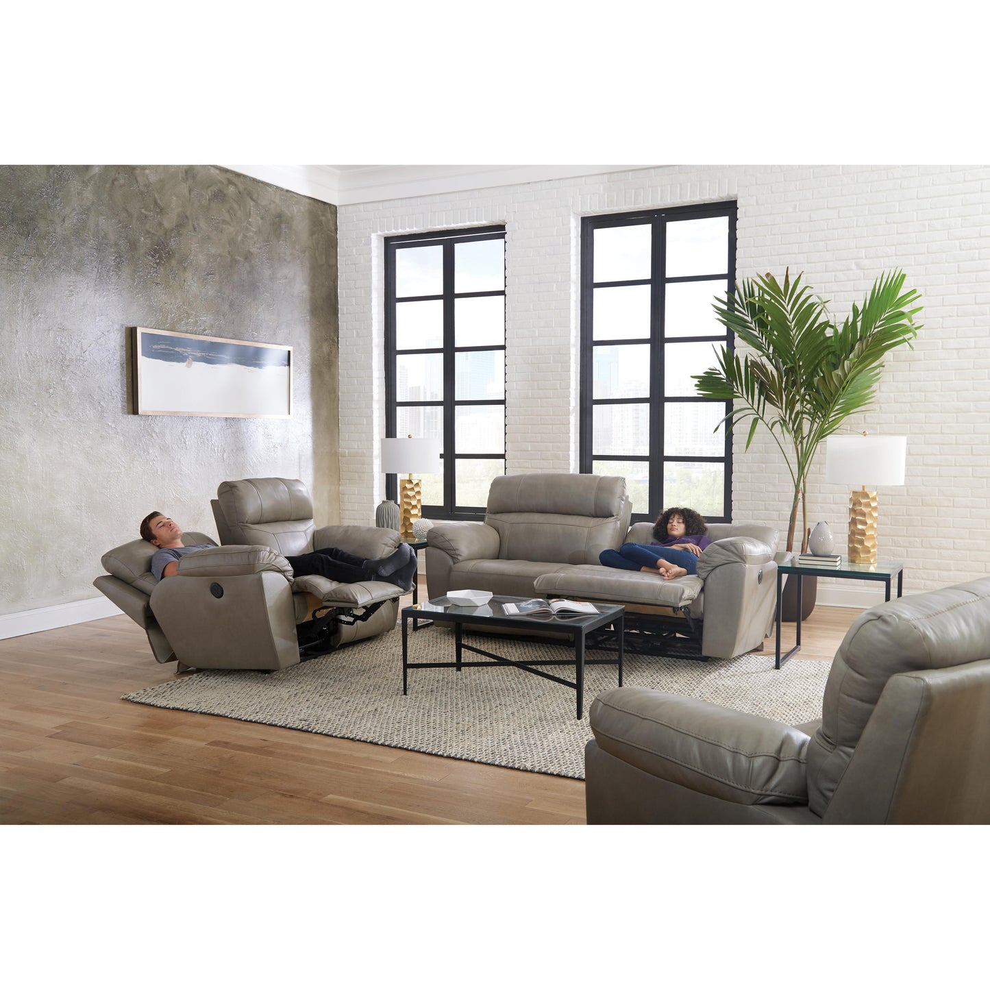 This lovely contemporary design Costa reclining loveseat offers comfortable seating. It comes in putty color top grain leather match upholstery. It features padded bustle backs, pad-over-chaise with padded footrest, and pillow arms. It has extra-wide seating and beautiful stitching accents.