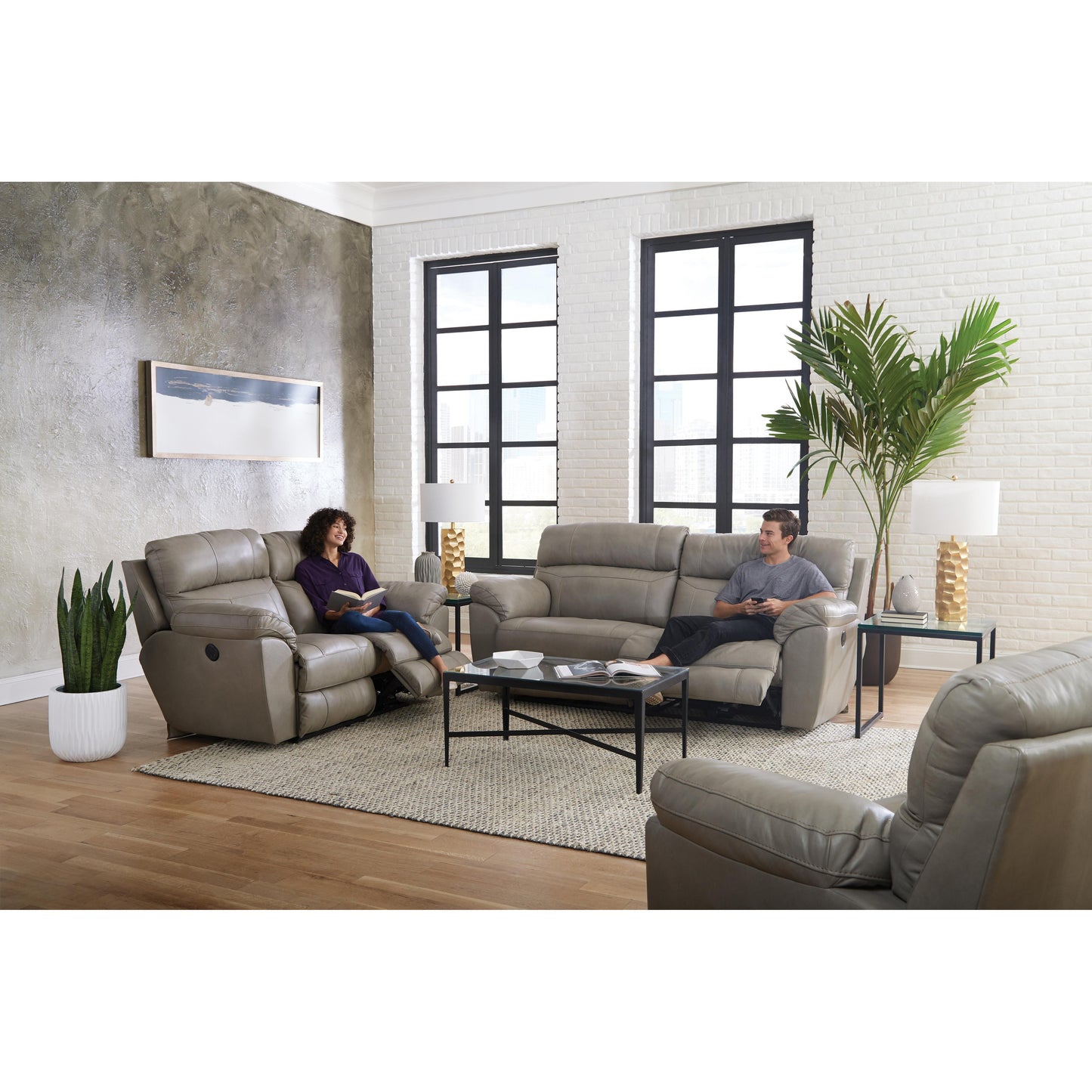 This lovely contemporary design Costa power reclining sofa offers comfortable seating. It comes in putty color top grain leather match upholstery. It features padded bustle backs, pad-over-chaise with padded footrest, and pillow arms. It has extra-wide seating, power button with USB charging port, and beautiful stitching accents.