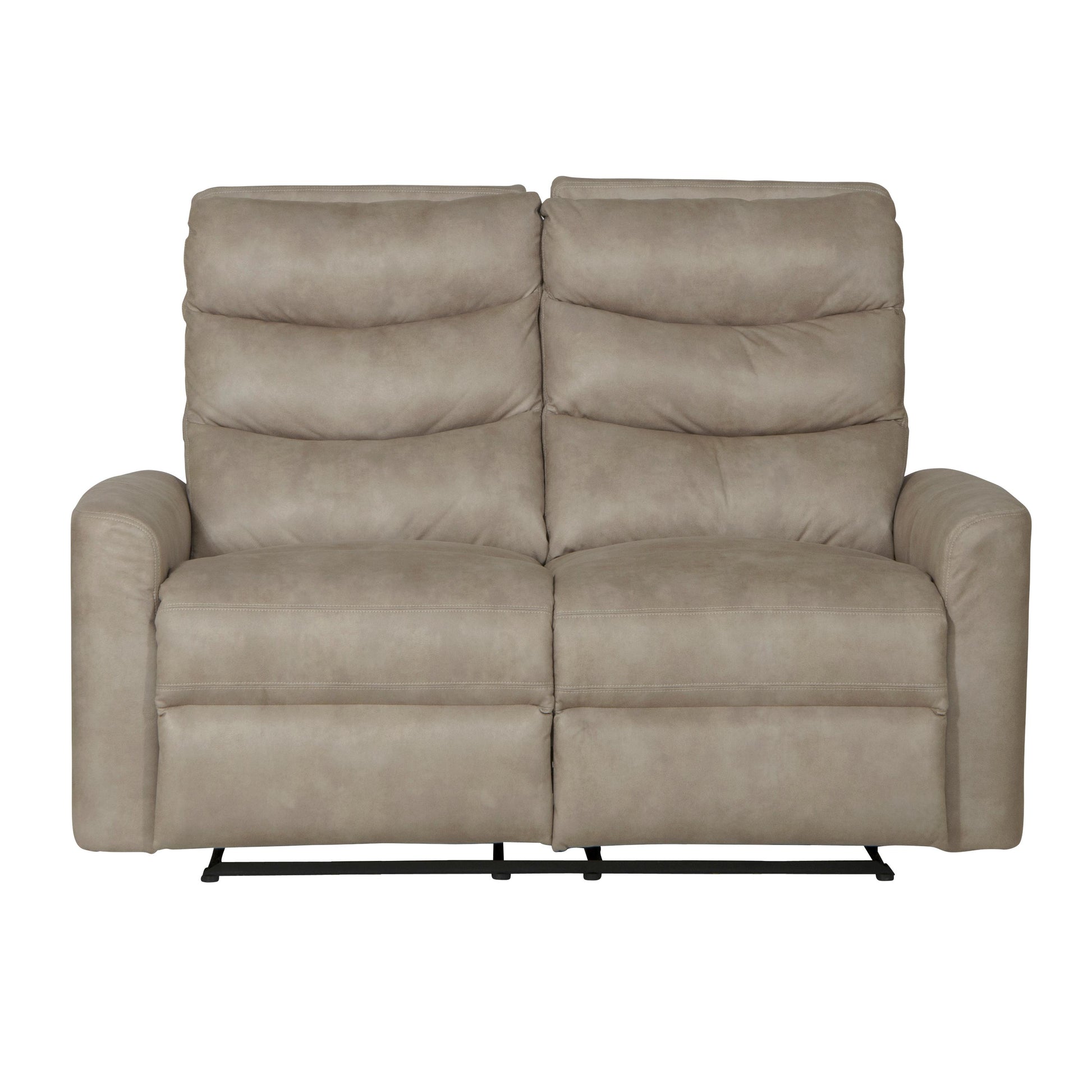 The Gill reclining loveseat comes in a putty faux leather fabric and offers comfortable relaxing seating. It features a waterfall-style back, pad-over-chaise with padded footrest, track arms, and stitching details.