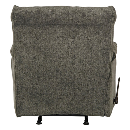 The Tosh Rocker Recliner is upholstered in soft pewter fabric and features a comfortable padded back pillow, a pillow pad seat, pillow arms, and padded footrest.