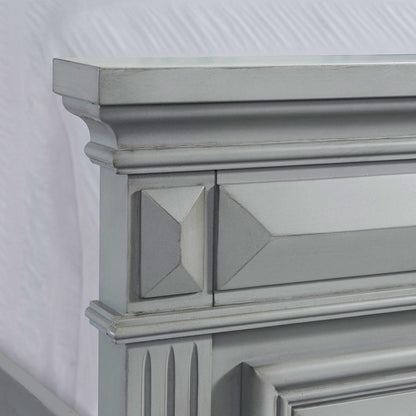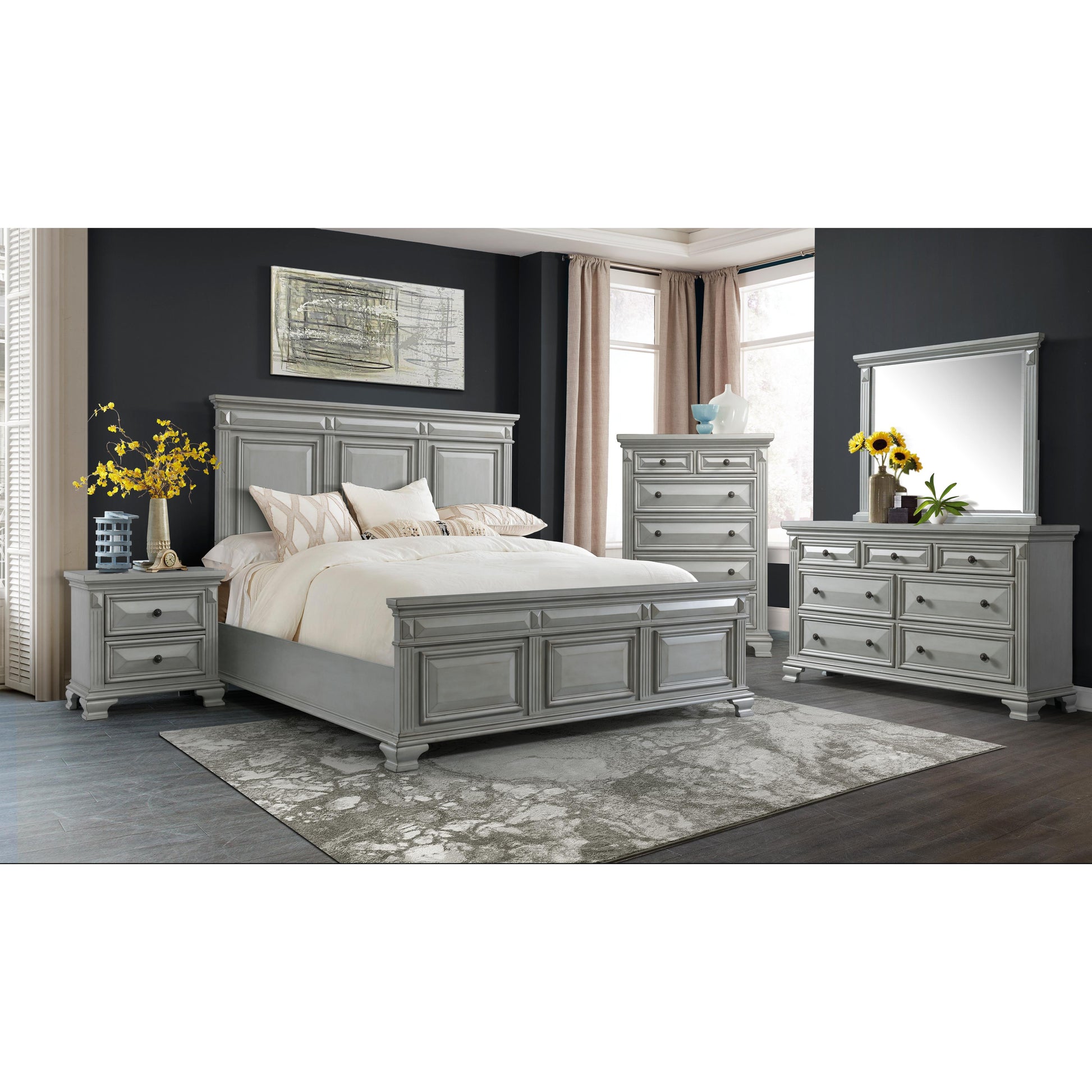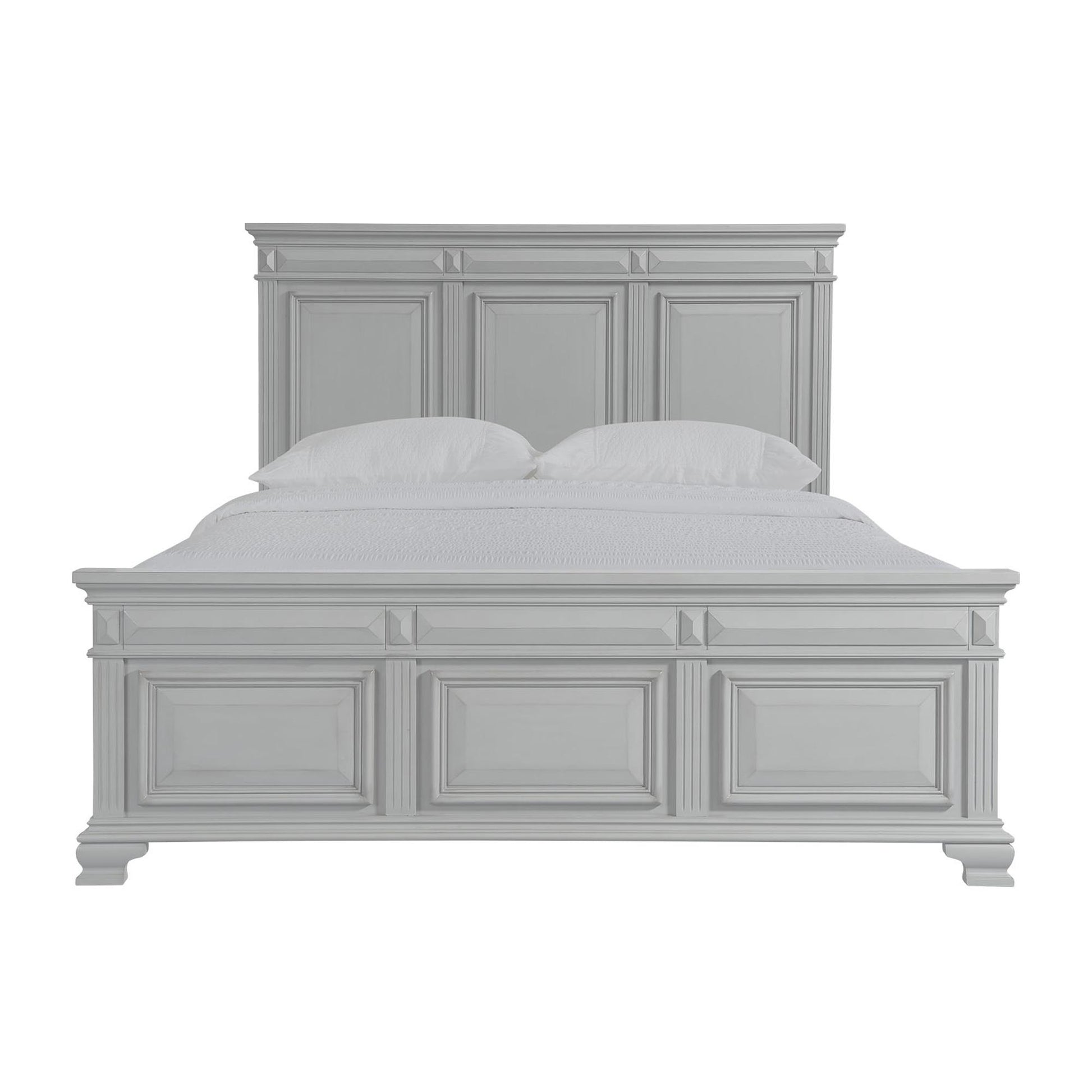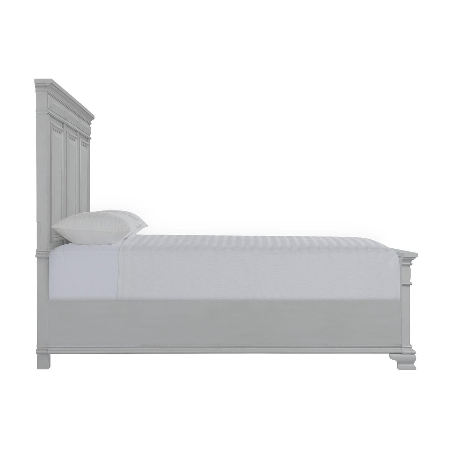 The Calloway Queen Panel Bed is the perfect addition to your bedroom! This panel bed features a high profile headboard, adding a little extra drama to your bedroom. Both the headboard and footboard feature a tri-panel design; making this bed a standout for years to come. Bevel edges are prevalent throughout, adding a classic touch to this transitional bed. Bracket feet combined with the grey finish will make this panel bed a staple in your home year after year.