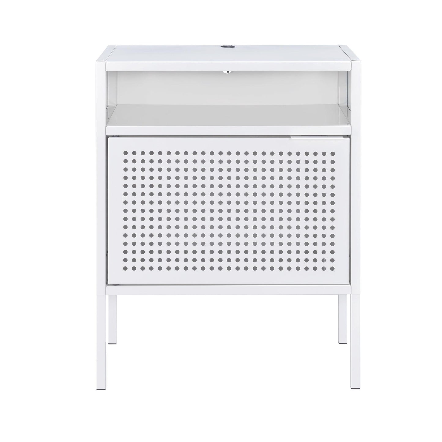 The Ember nightstand is a quick and simple way to update any room! This table can be used as a nightstand or as an accent table in your living room. You can even keep your devices charged while you watch your favorite show or while you sleep. The table is made of metal and features an open shelf space as well as a cabinet to store away your belongings.