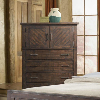 Add warmth and rustic design to your bedroom with the Jax chest. Dressed in a warm, smoky walnut finish, this piece features rich distressed woodgrain detail and a sleek wood panel design. It can keep you organized while bronze finished drawer pulls complete the look of this charming piece.