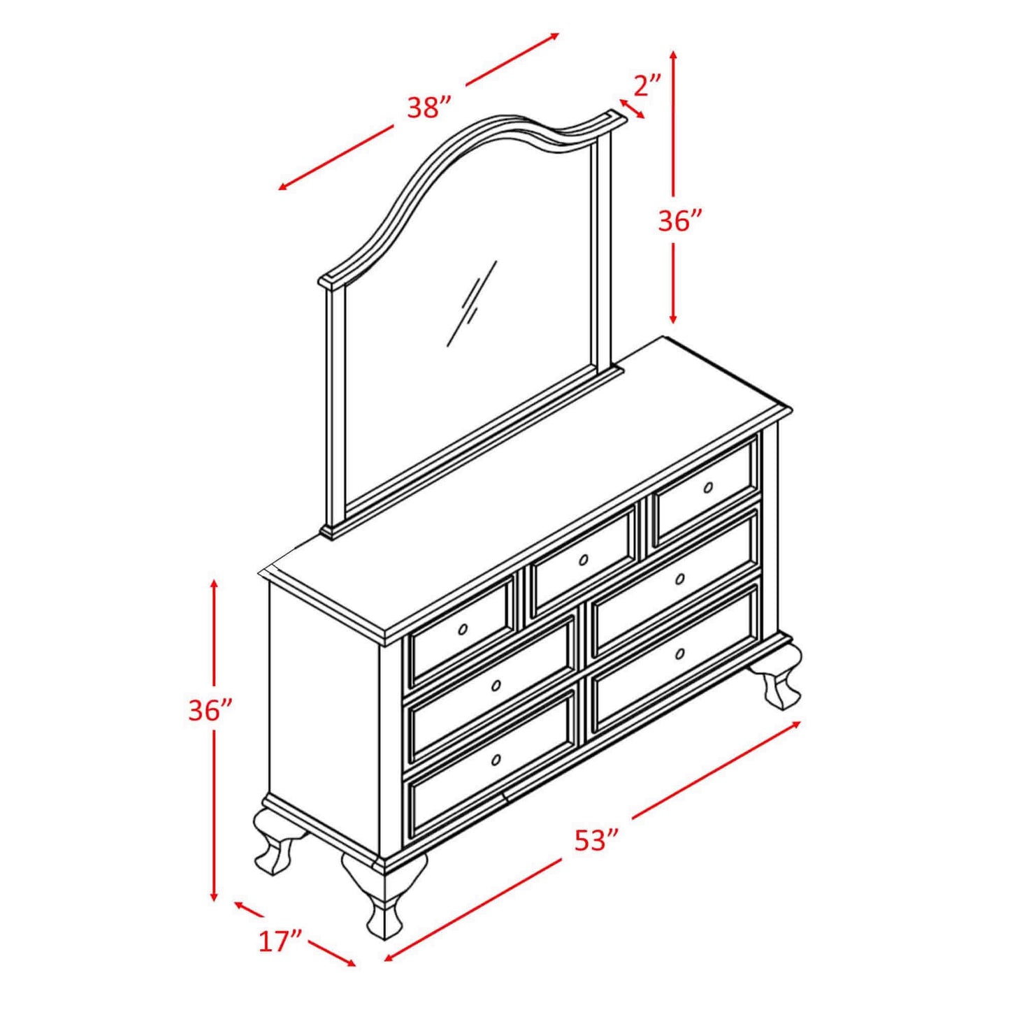 • Arched mirror: 2"D x 38"W x 36"H