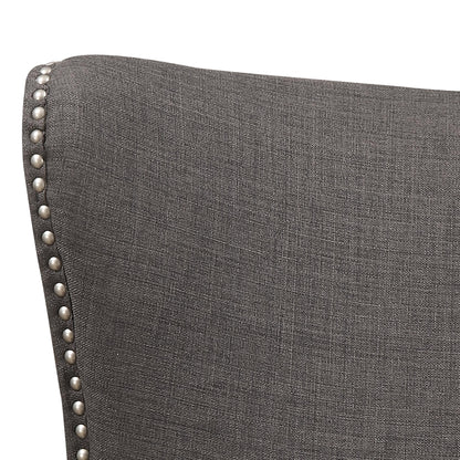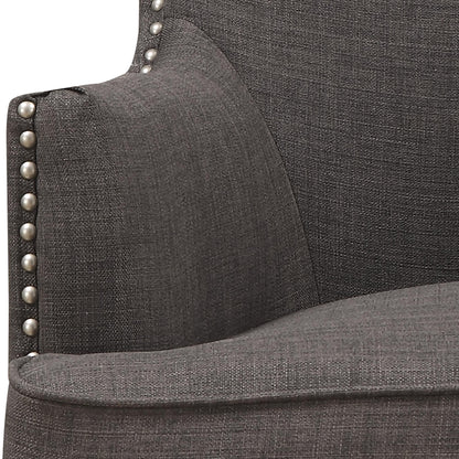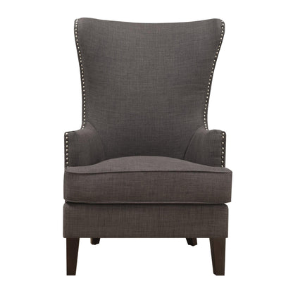 The delightful Kori accent chair boasts a charming Heirloom Charcoal color as well as a refined style. Resting on dark brown legs, Kori's crisp lines, elegant long back, and chic studded trim make this a one-of-a-kind upholstered sensation in any home.