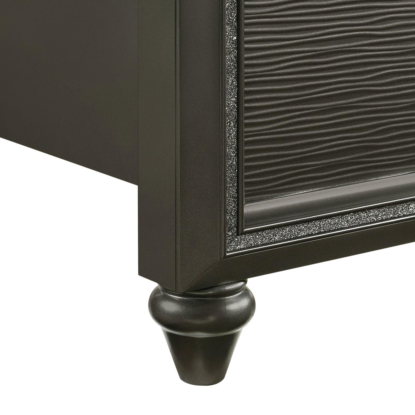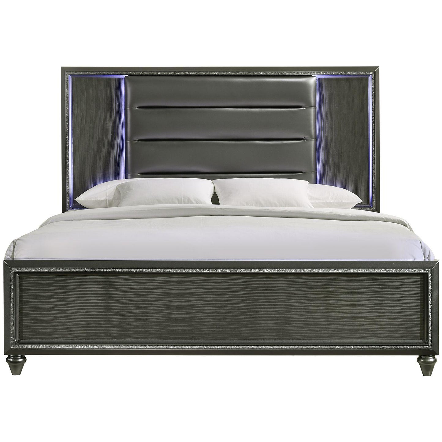 This Moonstone Queen Panel Bed is upholstered in polyethylene and consists of textural design throughout. It features mood lightening in the headboard to create a beautiful ambiance and is finished in a transitional, mountain gray. It is perfect for contemporary or modern bedroom aesthetics.