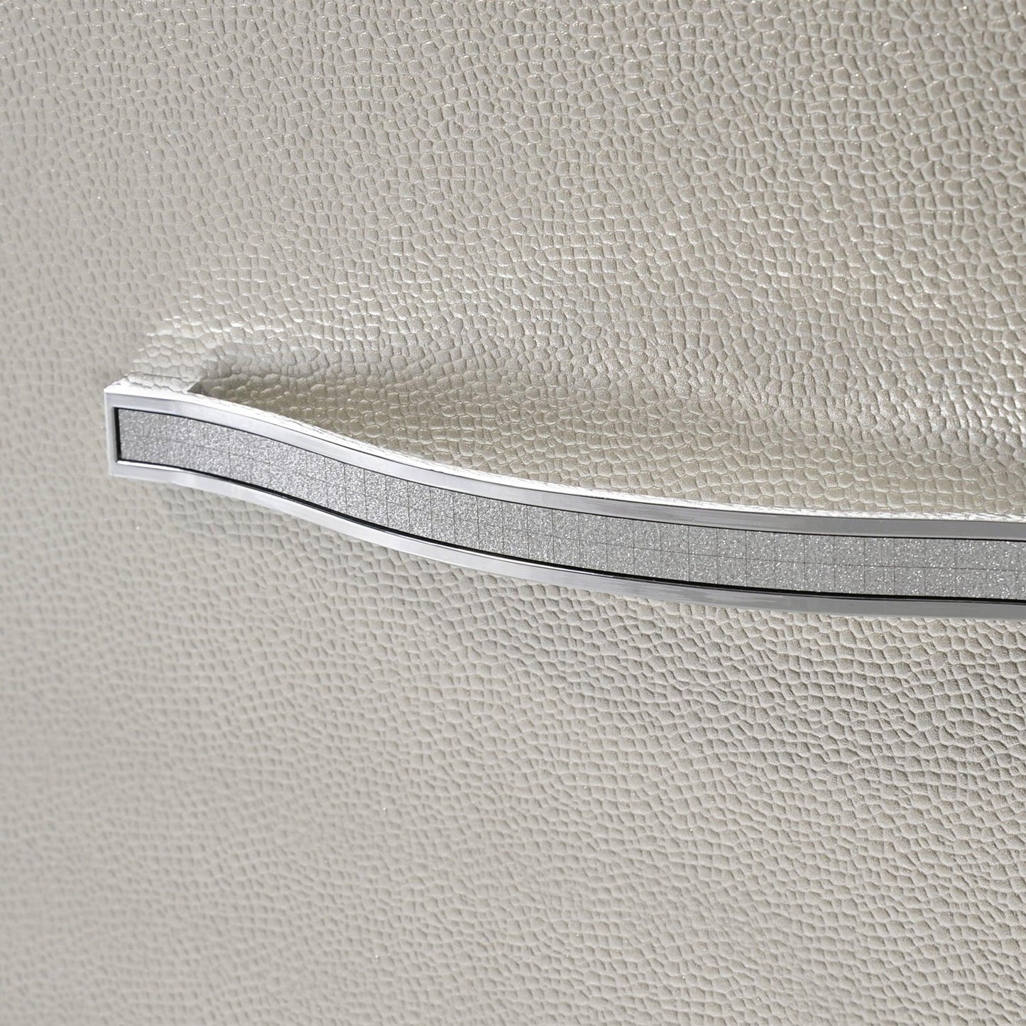 The Platinum Dresser & Mirror Set glams up your bedroom. Its chic champagne finish is accented by a decorative mirror trim throughout. Enjoy this piece's mood lighting featured in the mirror. Completing this fabulous look are sparkling, crystal, and chrome handles.
