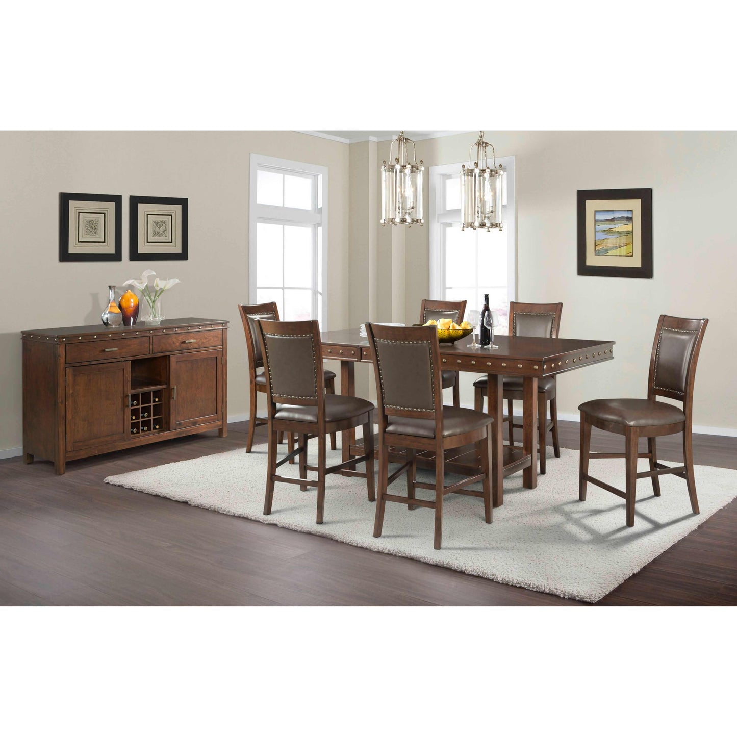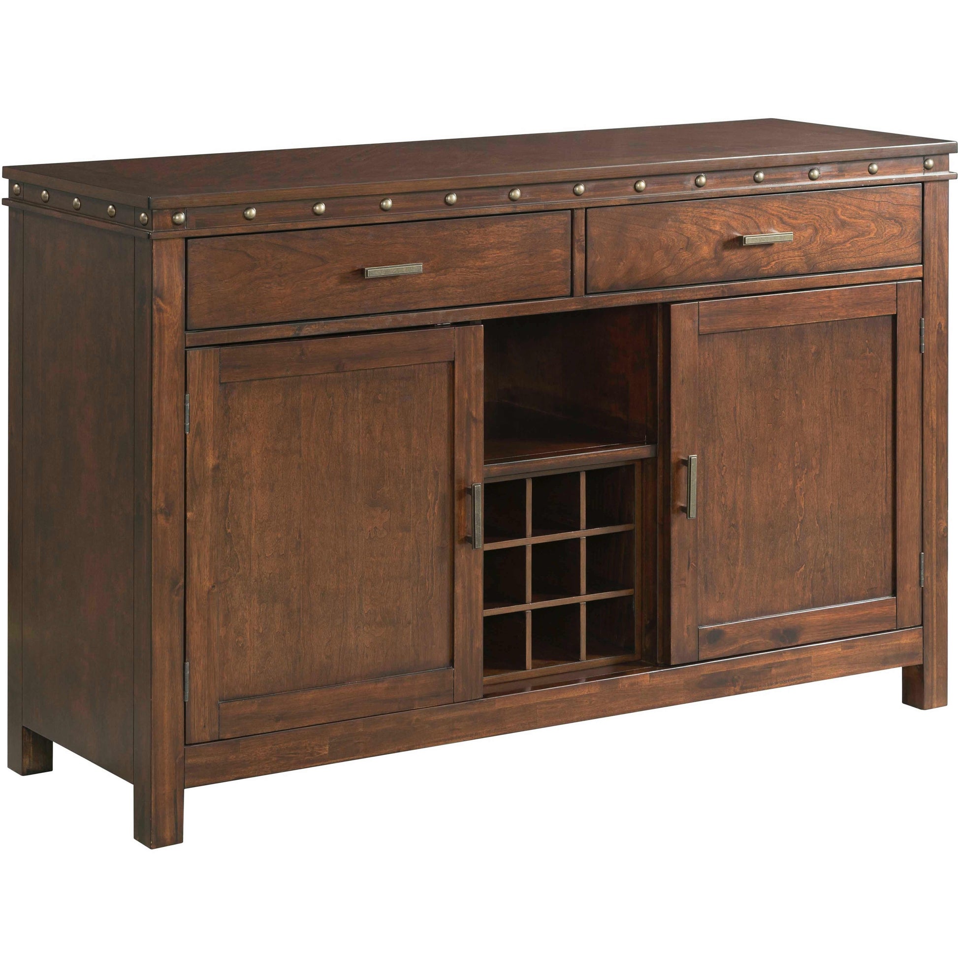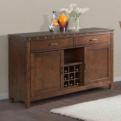 Gather for dinner in style with the rustic chic Prescott server. This charming piece features a walnut finish adorned with a bronze nailhead trim. Complete the look of your dining room with this fashionable server.