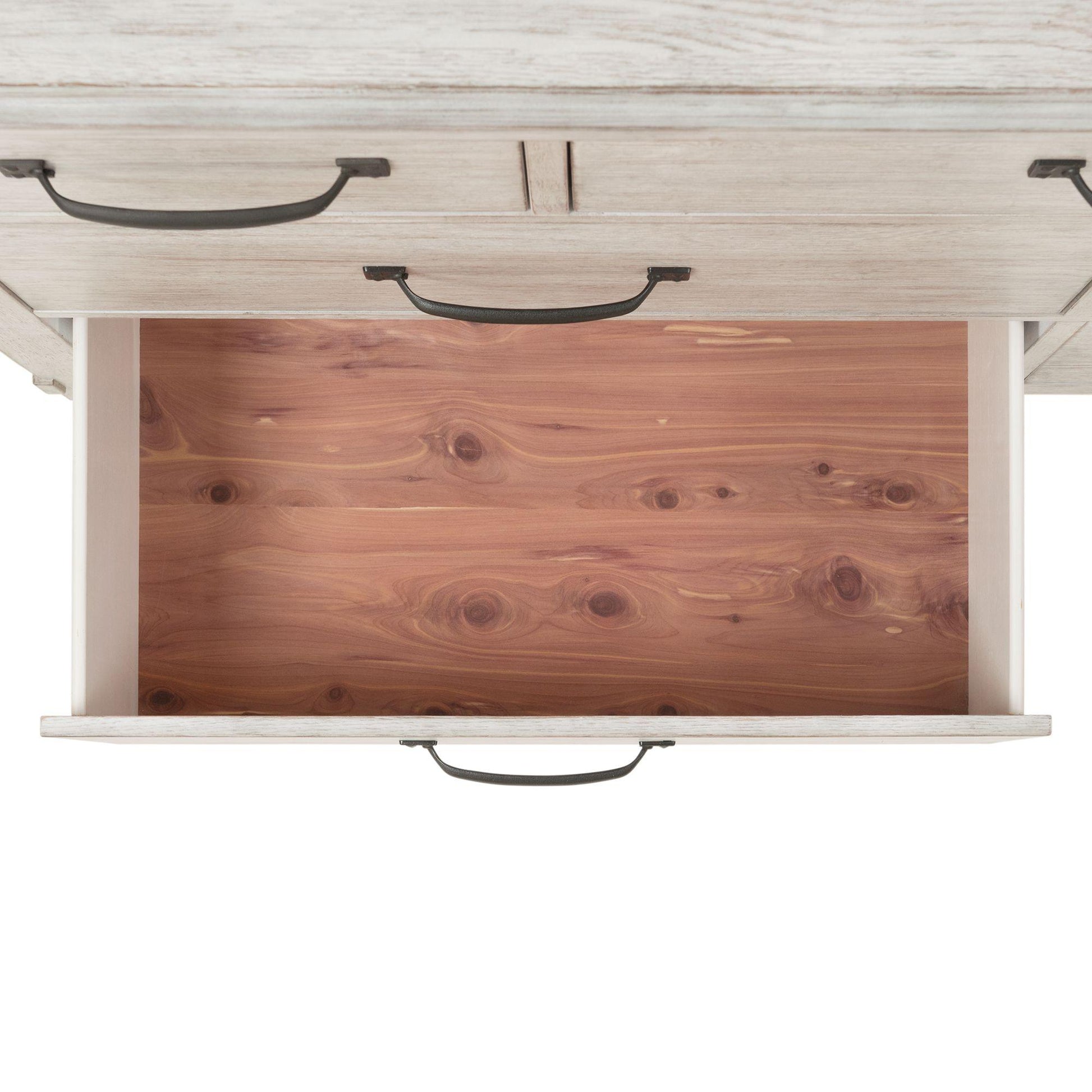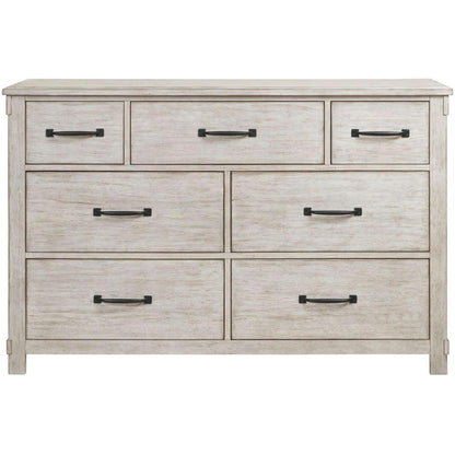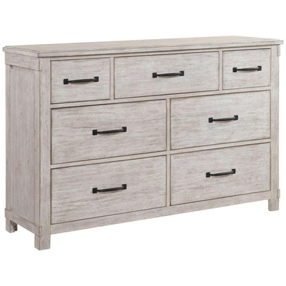 The Scott 7-Drawer Dresser is the perfect addition to your home! This dresser offers plenty of storage space for your clothes. The top drawer has black, felt lining to better protect your more delicate belongings. Dark metal drawer pulls complement the whitewashed, distressed finish beautifully. This dresser will easily match any existing decor you might have. Add this dresser to your home today for a transitional farmhouse look that will last year after year!