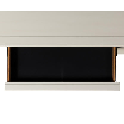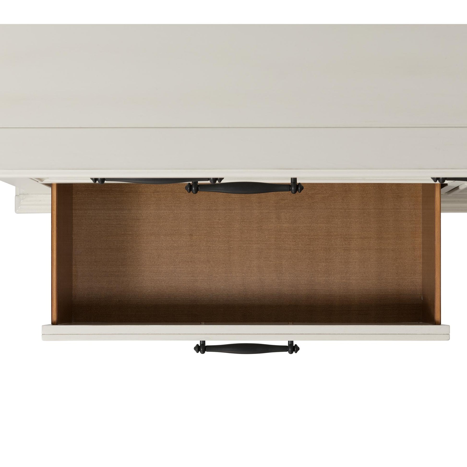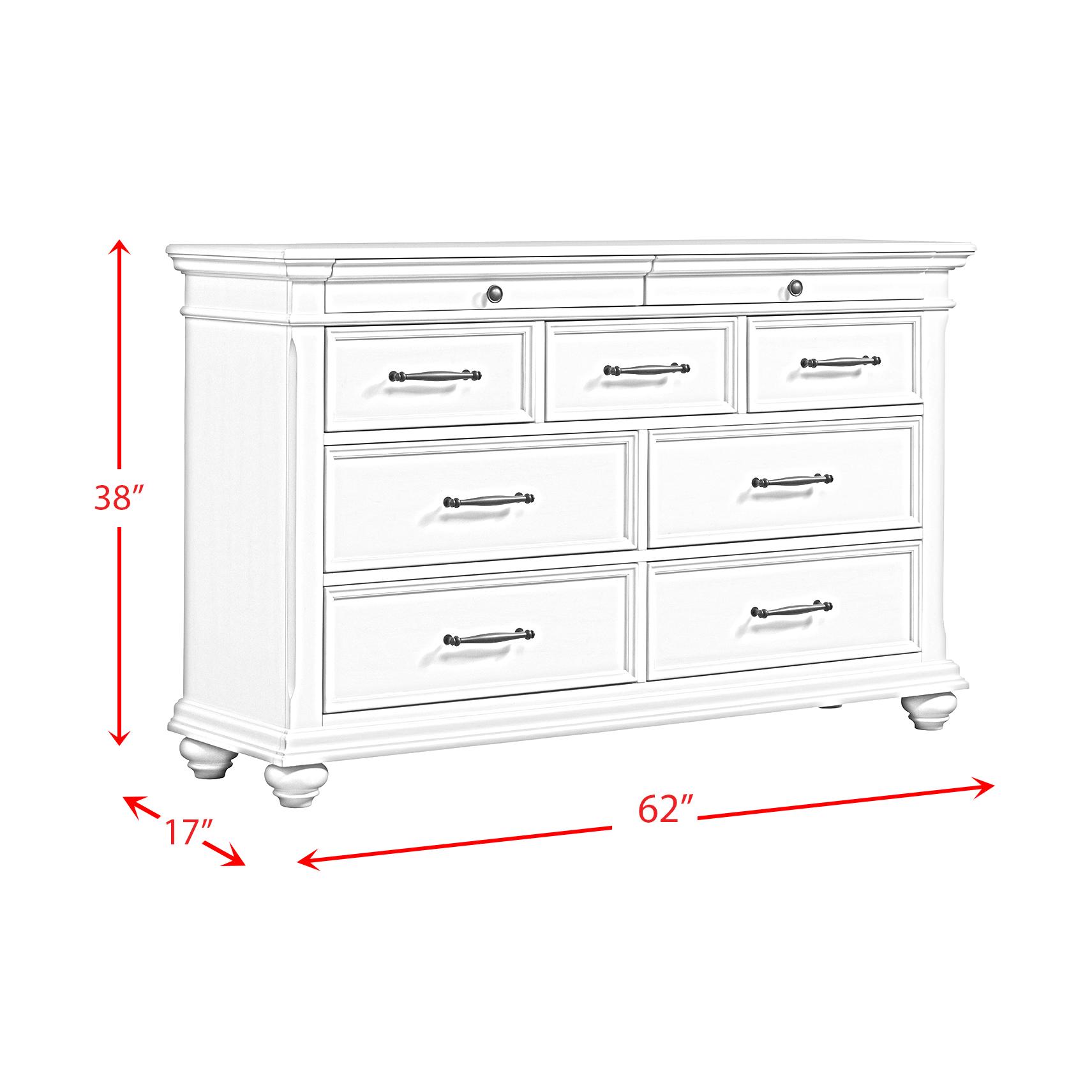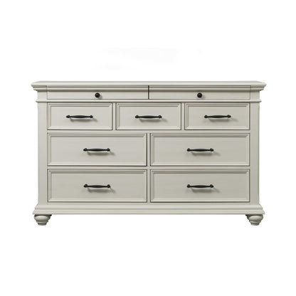 The Slater Dresser is going to look amazing in your bedroom! This horizontal dresser offers nine spacious drawers for storage; while the top drawers feature black, felt lining for you to easily store away your more delicate belongings. The dark metal drawer hardware beautifully pairs with the off-white finish, making it a gorgeous combo that will never go out of style. Bevel edges and bun feet complete the look of this transitional-style dresser. Add this piece to your home today for a look that you'll enjoy day after day!