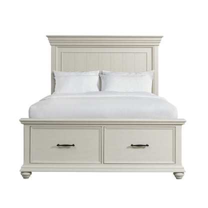 The Slater Queen Platform Storage Bed is going to look amazing in your home! This bed comes with two spacious storage drawers in the footboard, allowing you to easily store away extra blankets or linens. The headboard adds extra flair with its plank styling, making it a bed you'll want to fall into every night! The off-white finish adds character and charm and will never go out of style. The dark metal drawer hardware pairs beautifully with the finish; while the bevel edges and bun feet complete the look.