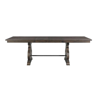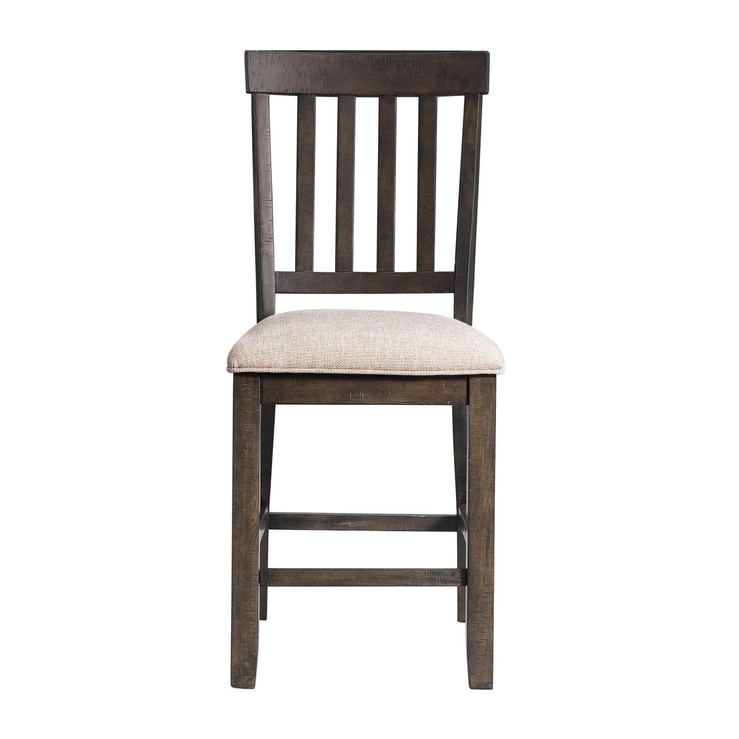 This Stone 7-piece counter height dining set features a table with a reverse, scroll-designed, trestle base, side chairs with an upholstered seat, slat back, and a charcoal finish. This set includes a counter height dining table and 6 counter height side chairs.