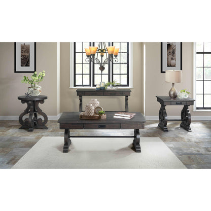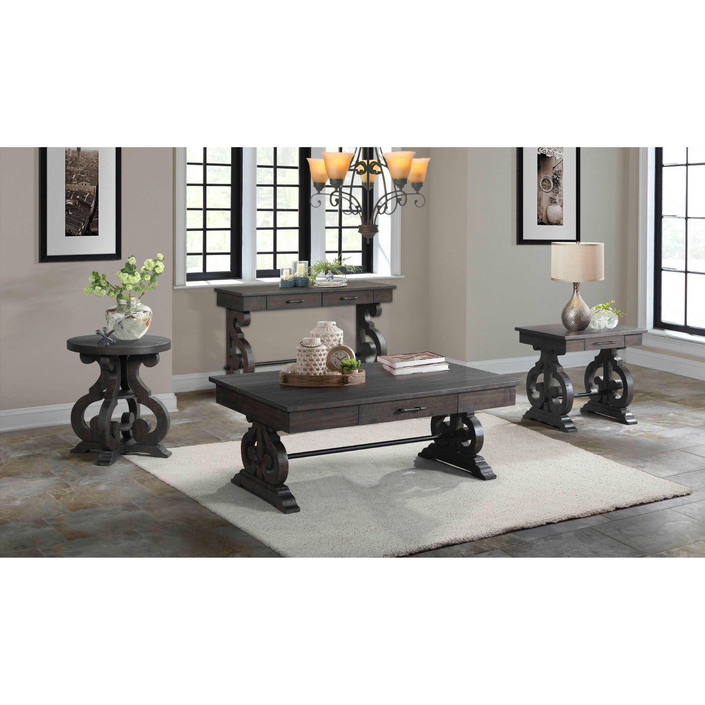 This Stone Occasional square side table features a drawer, elegantly scrolled legs, decorative dark finished hardware, and a smoky dark ash finish.
