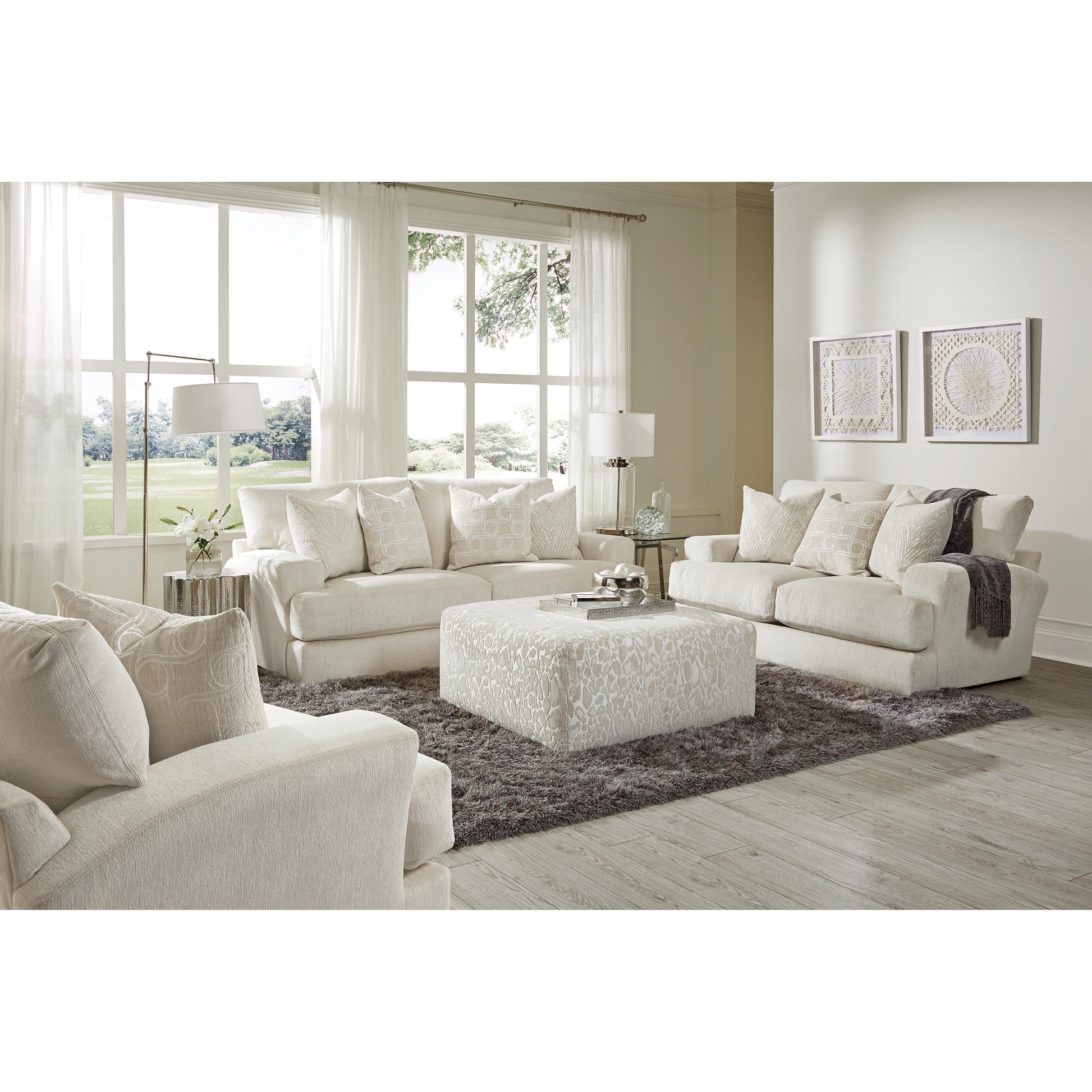 You will love the elegance and comfortable seating of the Lamar Loveseat. This beautiful piece is offered in a luxurious chenille fabric in cream color. It features t-style back pillows, t-style extra thick seat cushions, and large tapered arms.
