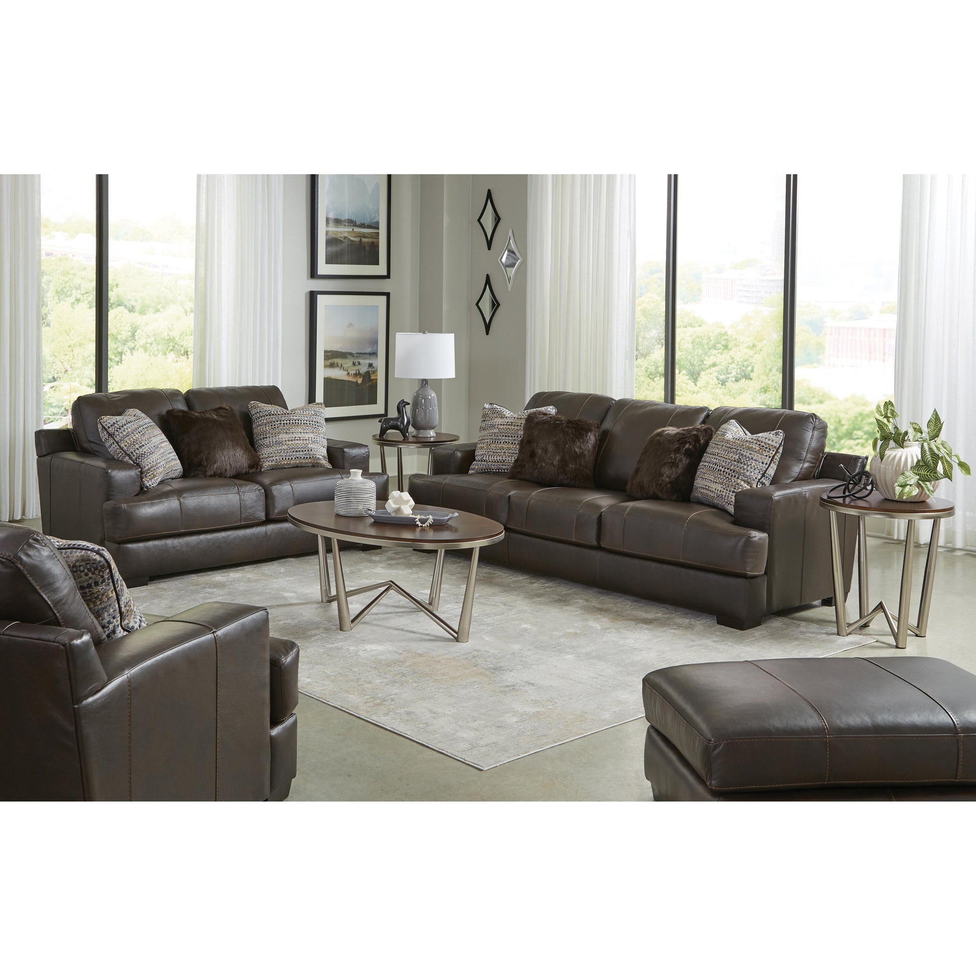 This Marco sofa features accent pillows with a contrast welt, track arms, and a chocolate leather match.