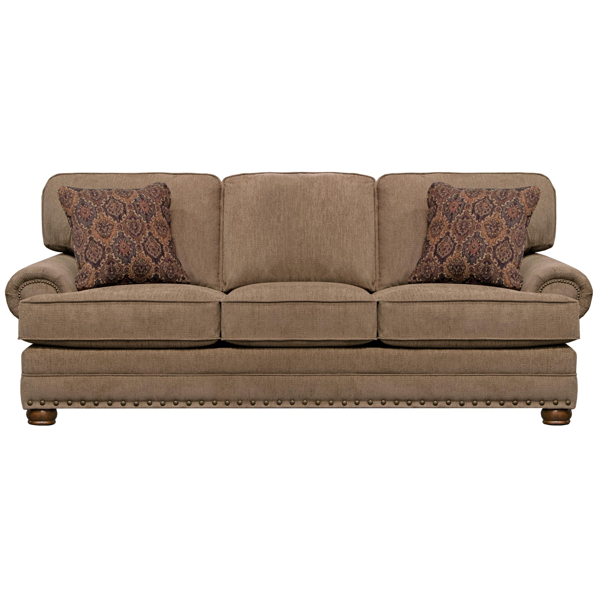 Plush comfort and traditional design well describe the Singletary sofabed. It features t-style padded back and seat cushions, padded rolled arms, sectioned front border, and wooden bun feet. It is adorned with welting details and nailhead trim accents on the front border and arms.