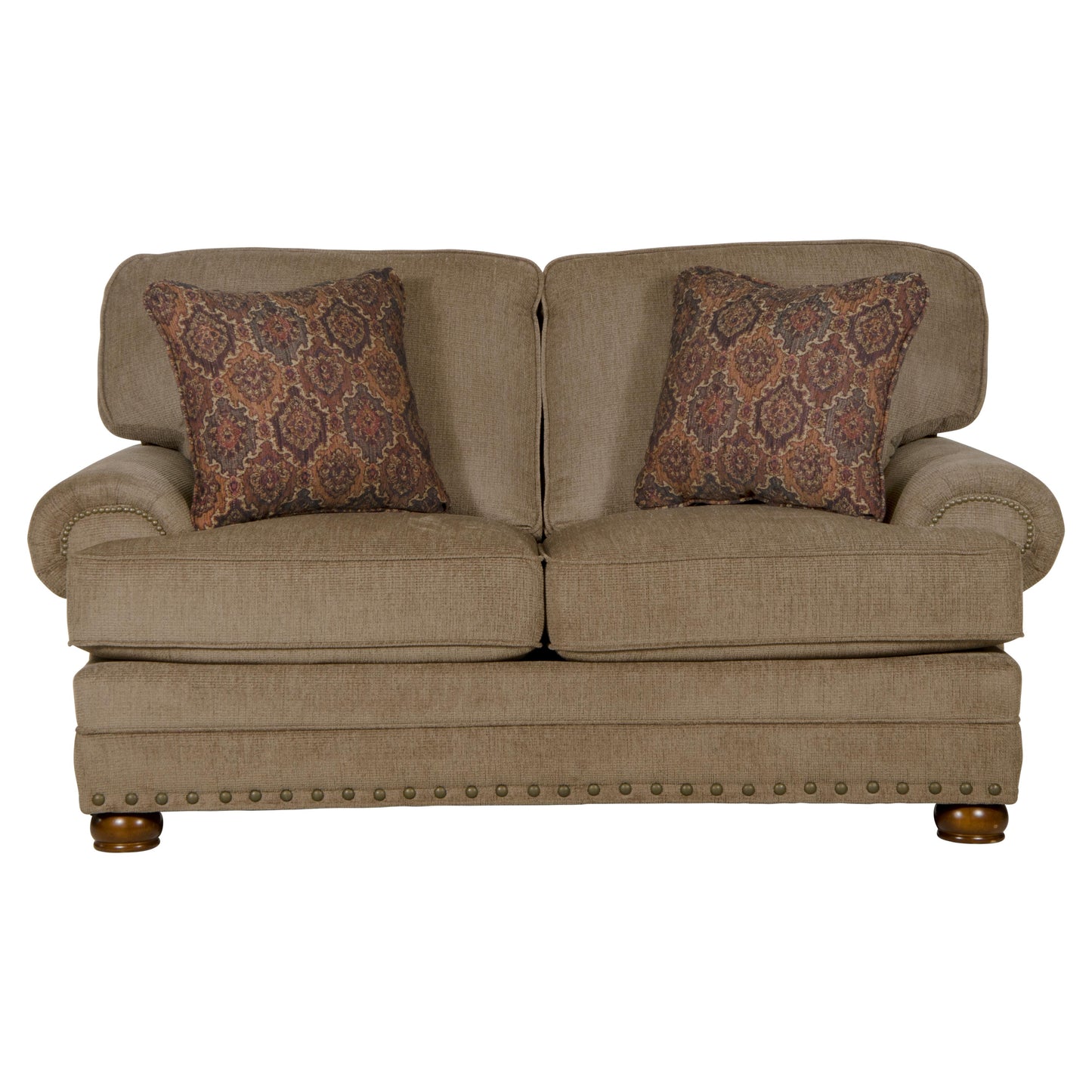 Plush comfort and traditional design well describe the Singletary loveseat. It features t-style padded back and seat cushions, padded rolled arms, sectioned front border, and wooden bun feet. It is adorned with welting details and nailhead trim accents on the front border and arms.