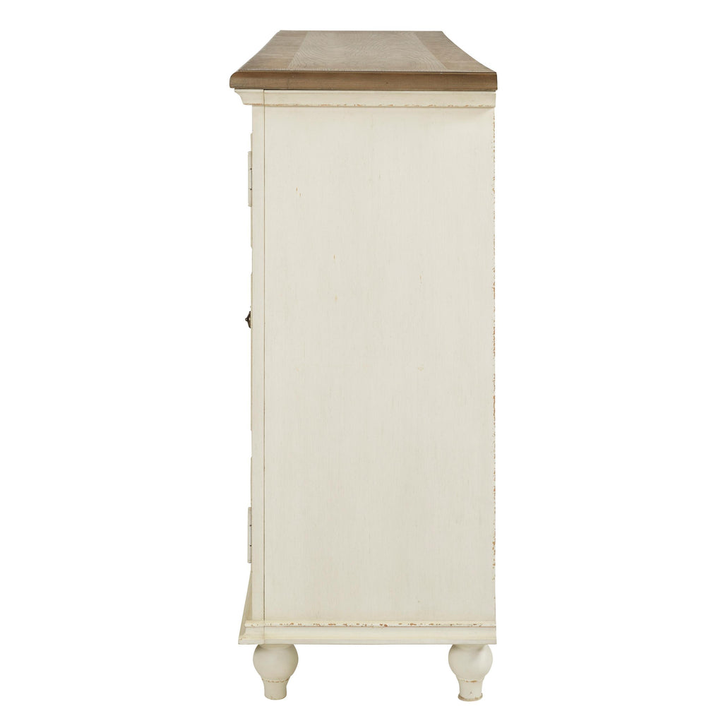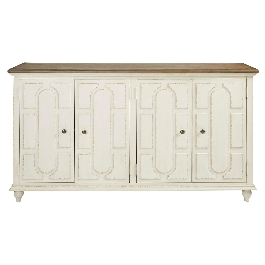 Whether your style is cottage chic, boho inspired or uniquely eclectic, this accent cabinet is sure to look right at home. Standout elements include raised panel door fronts that are a work of art. Wonderfully timeworn in antique white, this 4-door cabinet is topped with a warm brown finish for two-tone interest. Two adjustable shelves add to its practicality.