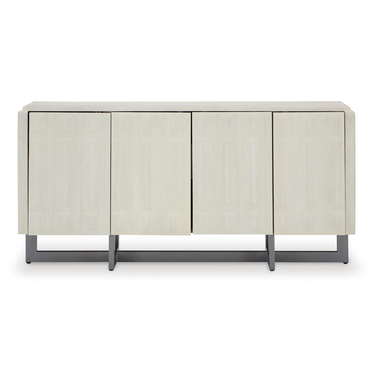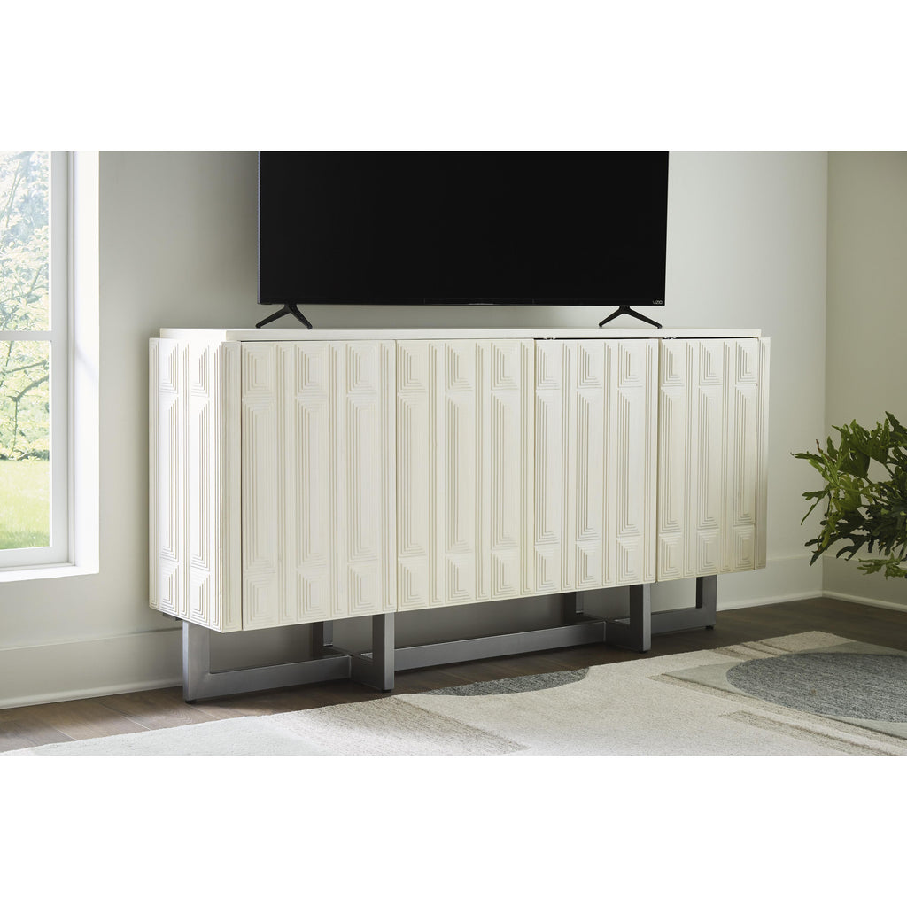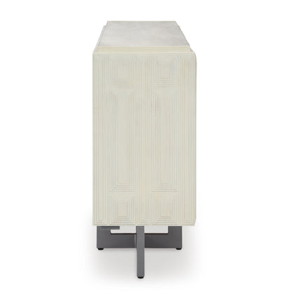 Keep things contemporary cool with the Ornawel accent cabinet. The step pattern on the door fronts lends an appealing geometric touch, with a lightly distressed white finish enriching the design. Touch latch doors open to reveal two shelves for all your storage needs. What a high-style statement.