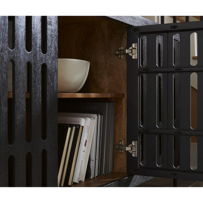 This accent cabinet showcases high-end style with a captivating design. A cleverly placed cutout offers a sneak peek inside, making it a versatile choice for use as a buffet, console or media cabinet. Contemporary and casual, this piece epitomizes laid-back luxury.