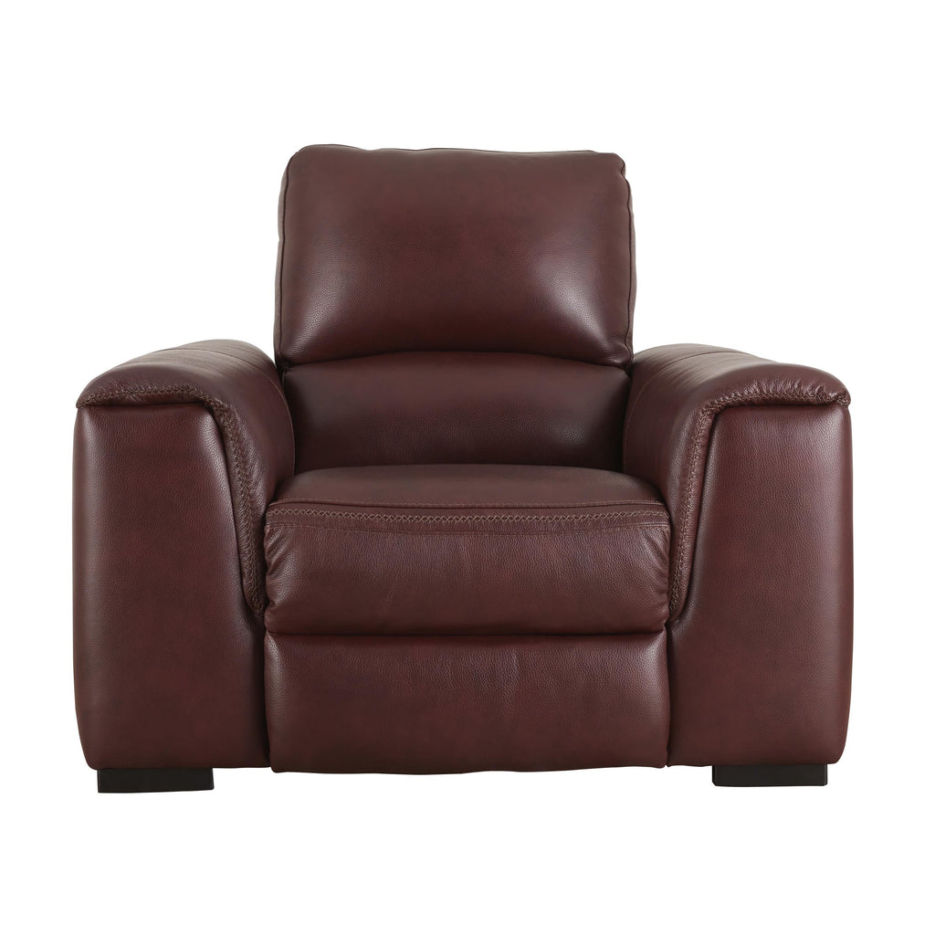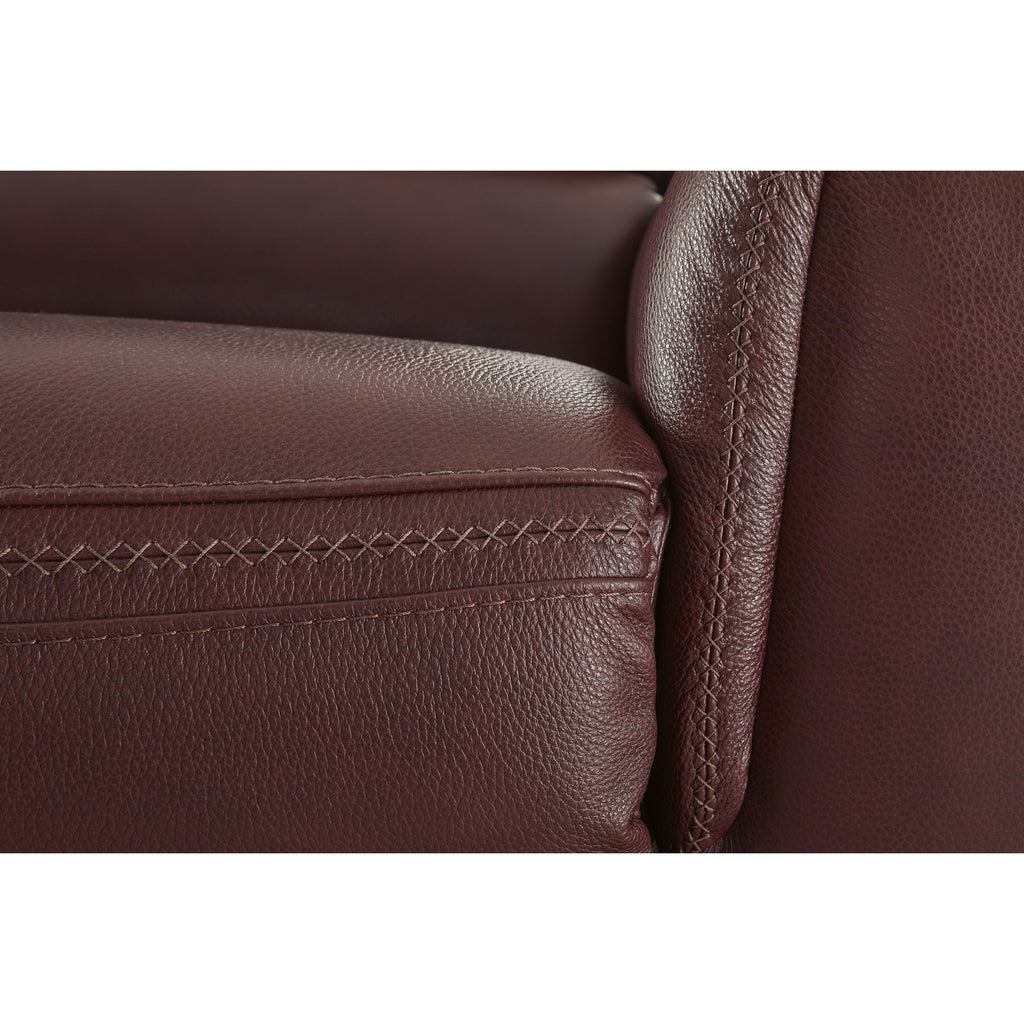 Impressive in scale while keeping an air of refinement, this power recliner stuns with a combination of soft, supple leather and perfectly matched faux leather upholstery in garnet. Sink into the seating area and cater to your comfort with one-touch power reclining and an adjustable headrest. Complete with USB charging, this recliner makes a surefire statement in your contemporary living room.