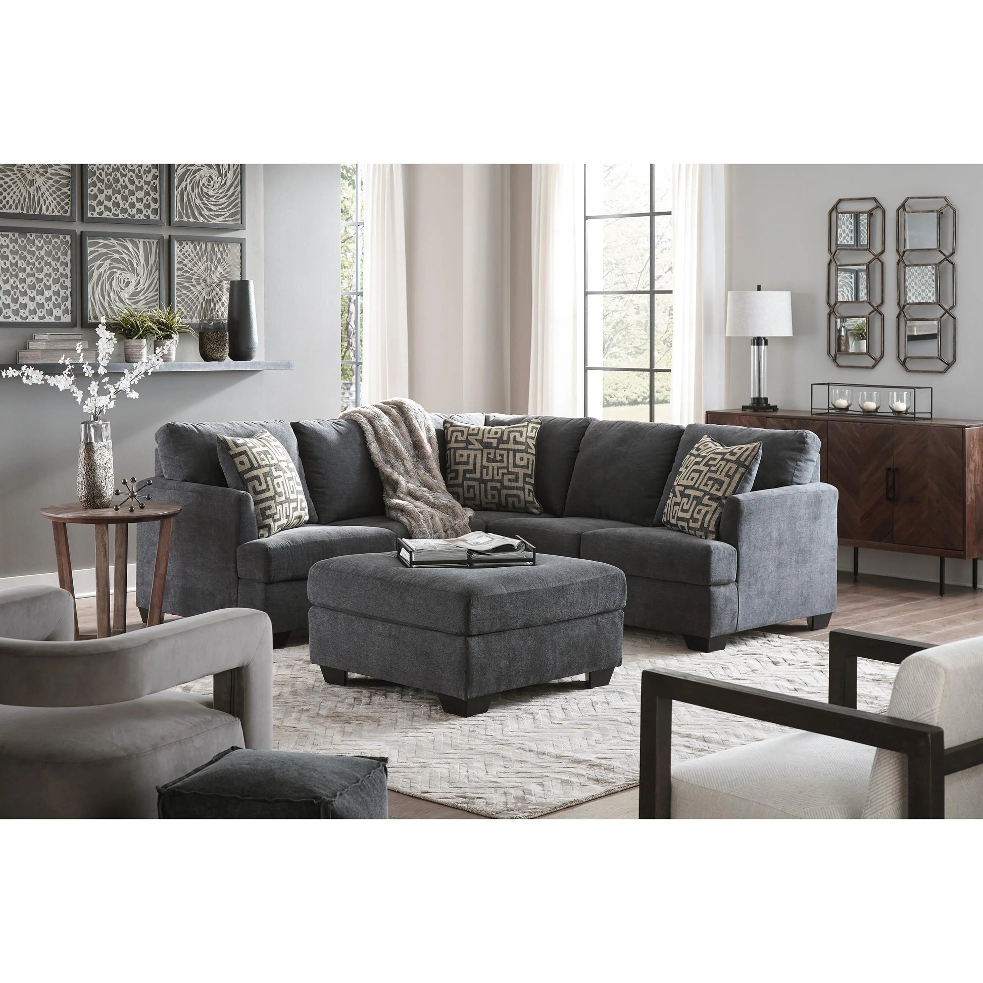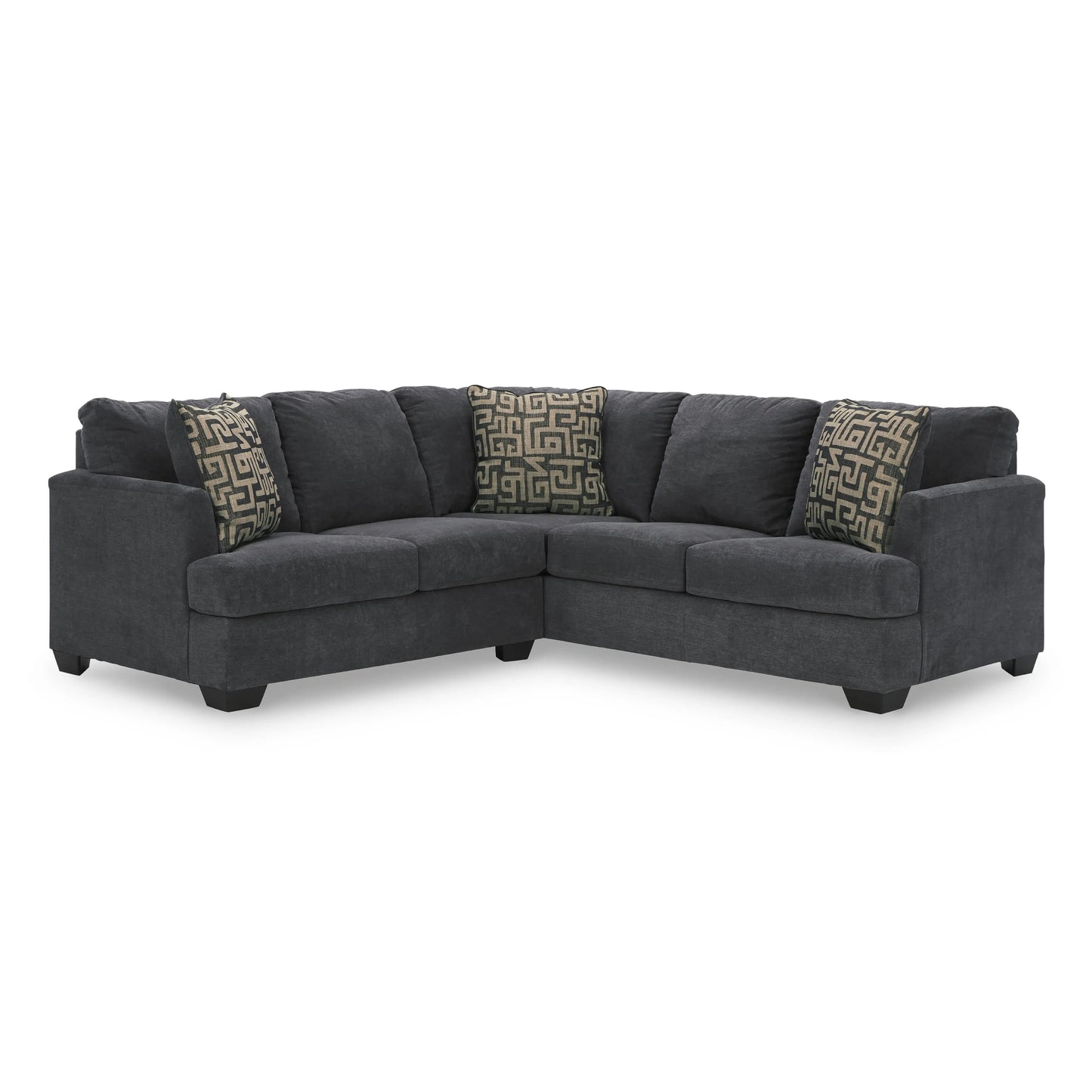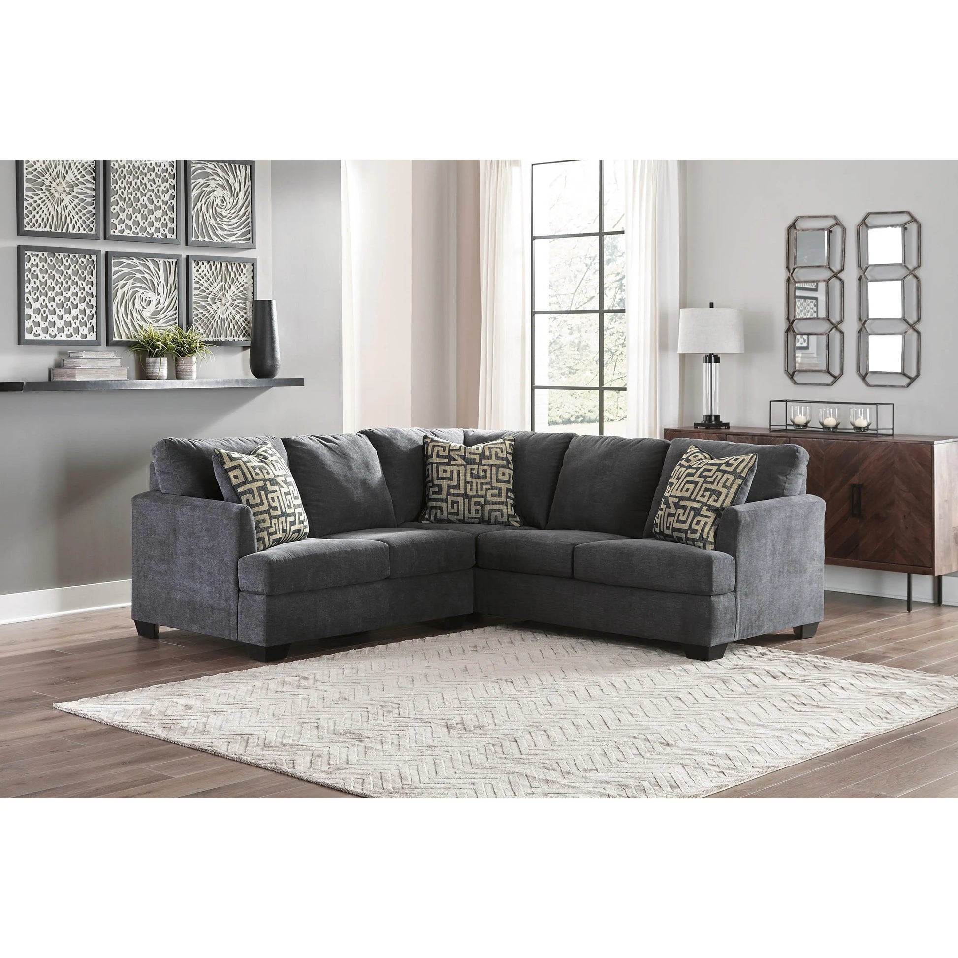 This sectional makes a stylish statement in modern design. Velvety soft upholstery is love at first touch, and its stunningly simple look is right at home in contemporary decor. The neutral gunmetal hue blends easily with any color scheme. Patterned accent pillows in complementary colors add bold contrast and a soft touch.