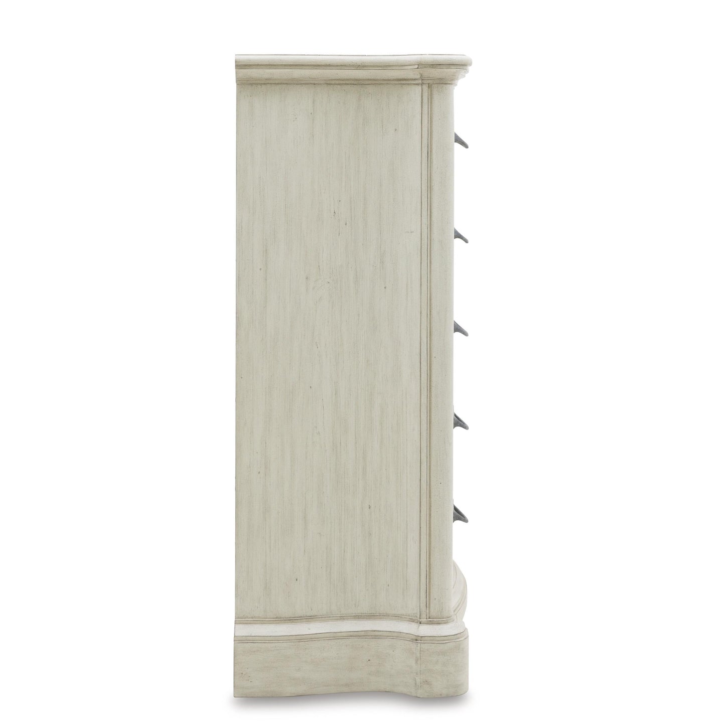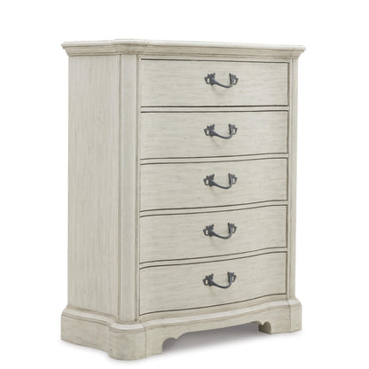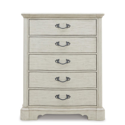 Add a touch of romance to your bedroom with this chest of drawers. Its antiqued white painted finish and serpentine-shaped silhouette details are the picture of easy elegance. Five spacious drawers offer ample storage space, while custom-designed bar pulls add originality.