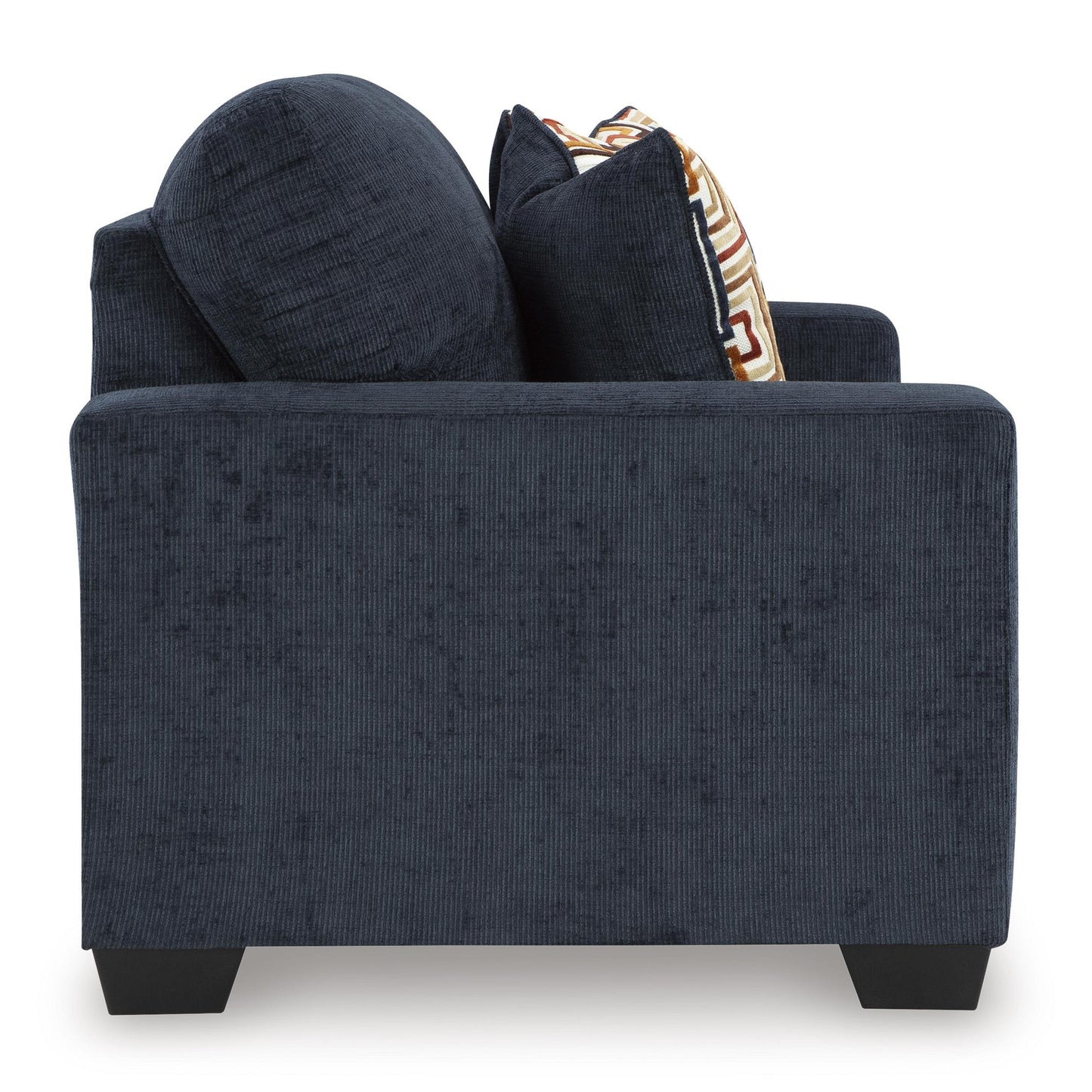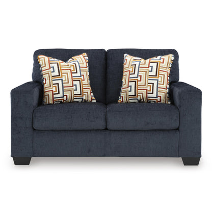 Looking to make a bold statement with color? Liven up your living room with this loveseat. Its trend-right navy blue upholstery adds a playful pop of color to your decor. Bold and eclectic accent pillows complete the look. Pairing posh style with everyday comfort, this piece is a welcome addition to contemporary spaces.