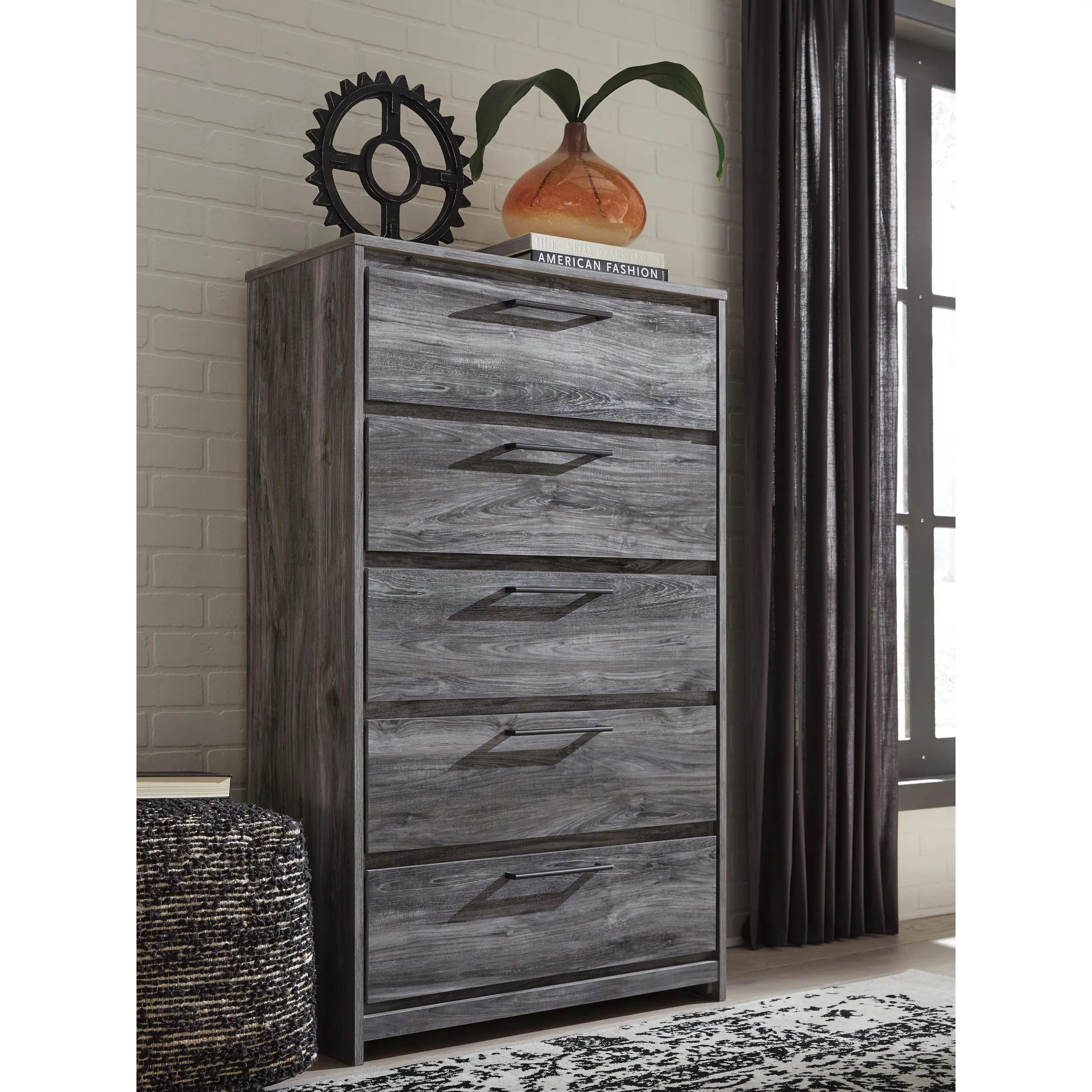 Beachy style and lots of storage go hand in hand with this chest. Its driftwood and surfer-inspired smoky finish creates a rustic look that's perfect for setting the scene of an island getaway. Five roomy drawers give you the space needed for stowing away clothes and more. Clean lines and modern handles provide an authentic look to be admired for years to come.