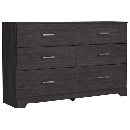With its clean-lined look and modern attitude, this bedroom set is a fresh style awakening. Warm charcoal hue over replicated oak grain easily complements other furniture finishes. Smooth drawer fronts with antiqued pewter-tone handles complete the aesthetic. This set includes a queen panel headboard, footboard and rails as well as a dresser, chest and nightstand.