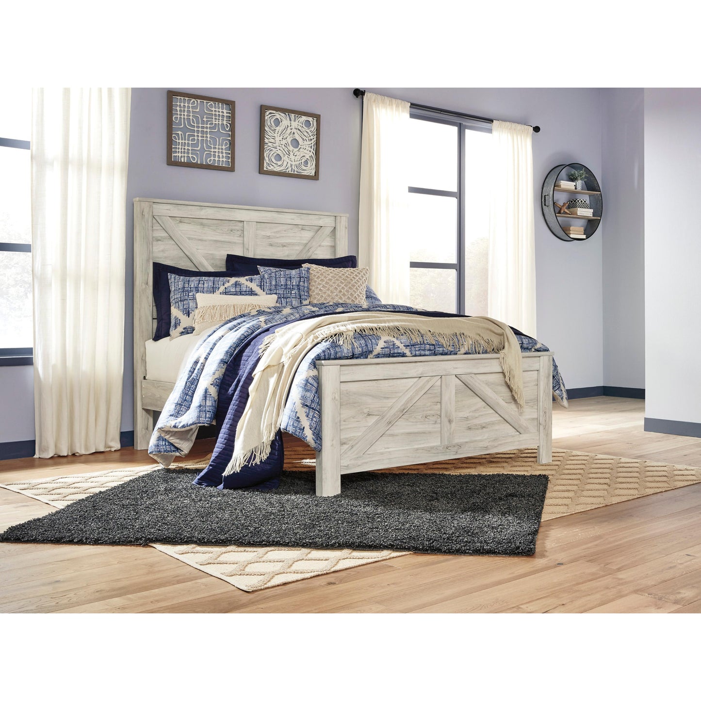 Your bedroom isn’t just a room. It’s a canvas. Express your farmhouse style with the Bellaby 7-piece queen panel bedroom set. A wispy white finish over replicated oak wood grain brightens up the space with charm. Brushed nickel-tone handles with black edging finesse the pieces with a bit of shine. Drawers are spacious and lined with faux linen laminate to hold your belongings with care. This clean-lined profile is the perfect authentic foundation for inviting decor. This set includes a queen panel headboard, footboard, rails, dresser, mirror, and 2 nightstands.