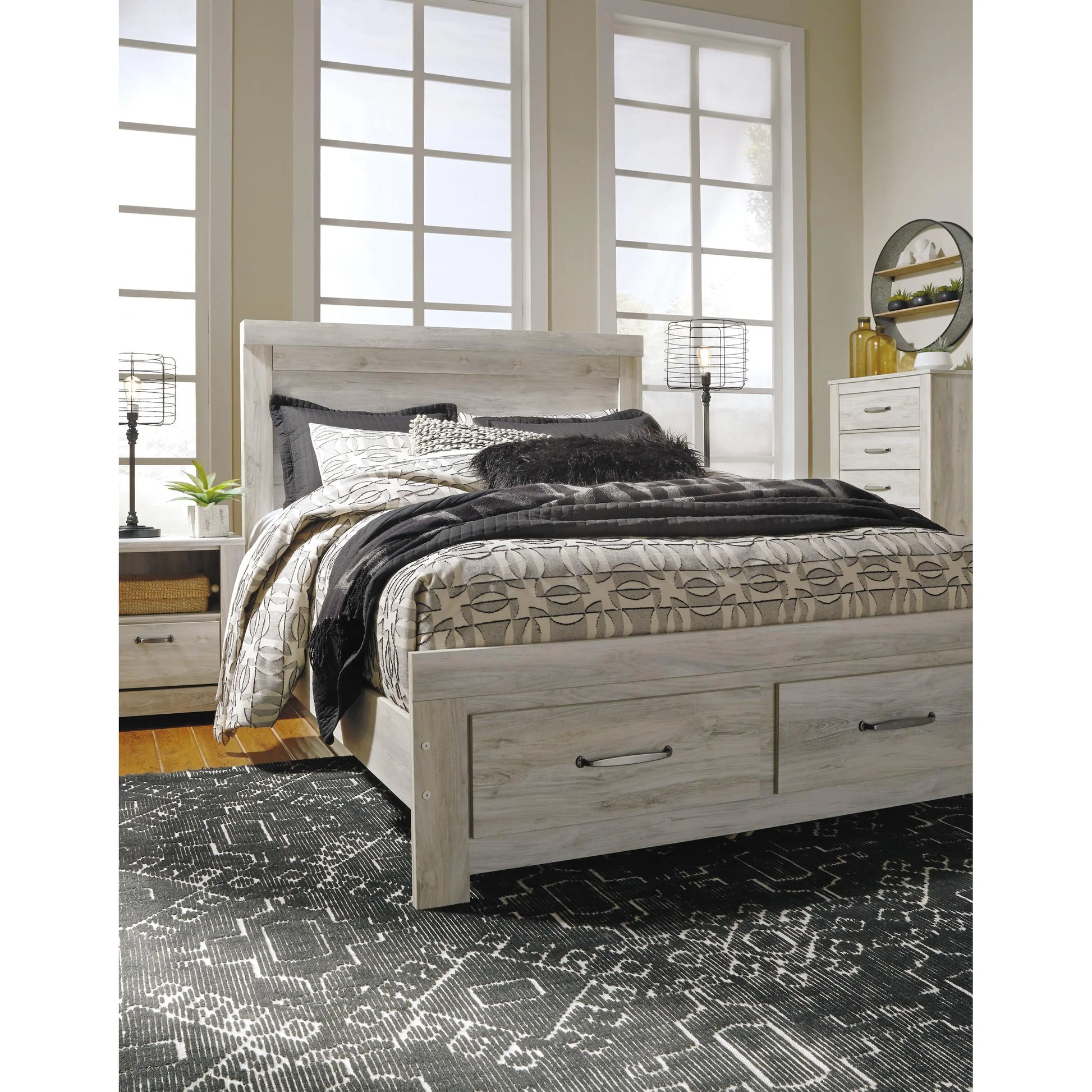 It’s gorgeous; it’s modern farmhouse; it’s this queen storage bed. Wispy, whitewash finish infuses so much character without covering the grain for that weathered, rustic look you crave. Clean-lined, classic panel styling and a pair of drawers at the foot of the bed provide a countrified-chic bedroom retreat that’s a breath of fresh air. Mattress available, sold separately.