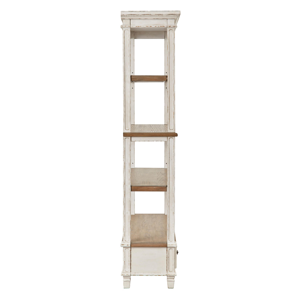 Elevating the art of traditional cottage styling, this bookcase is your heavenly home office realized. Its antiqued two-tone aesthetic blends a chipped white with a distressed wood tone top for added charm. The bookcase’s clever balance of shelf and drawer space beautifully works.