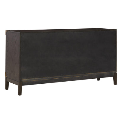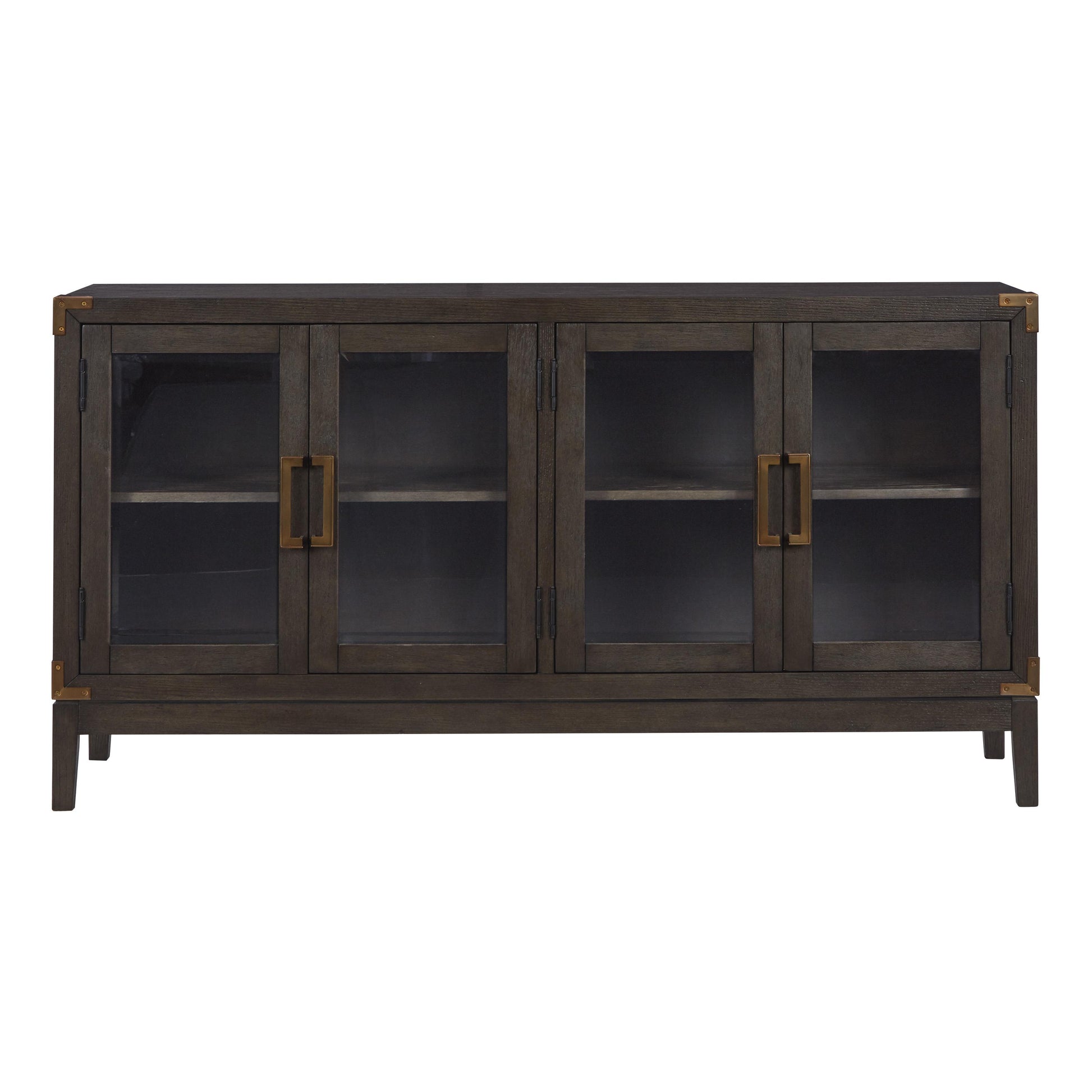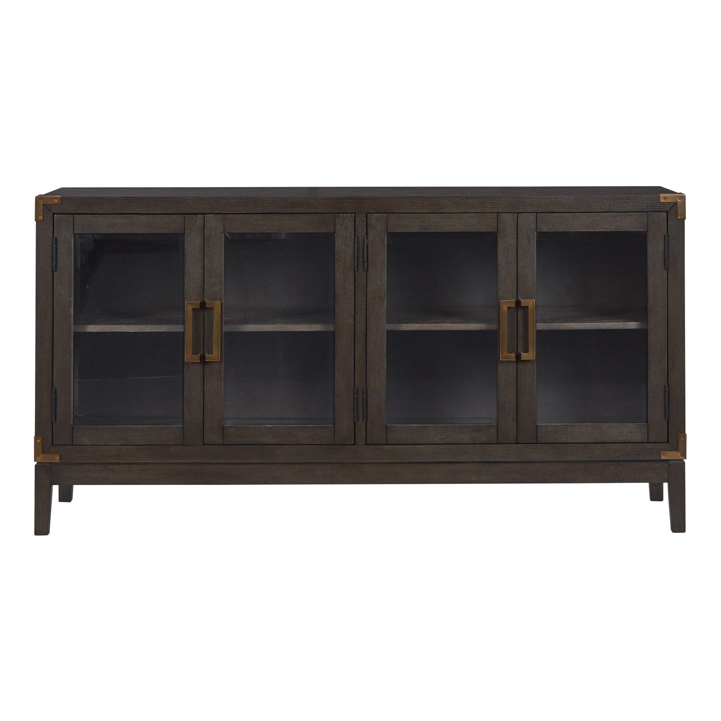 Dressed to thrill, this simply stunning dining server offers a high-design look at a down-to-earth price. Ultra sleek lines are accentuated with a dark waxy brown oak-tone finish that’s so easy on the eyes. Custom bar pulls on the double-door cabinets emphasize the server's clean, modern lines, while their brass-tone finish and metal accents in the same coloration complete the upscale aesthetic. Beautiful inside and out, glass front doors showcase the adjustable shelving to create a display and storage piece with a timeless look that's made to last.