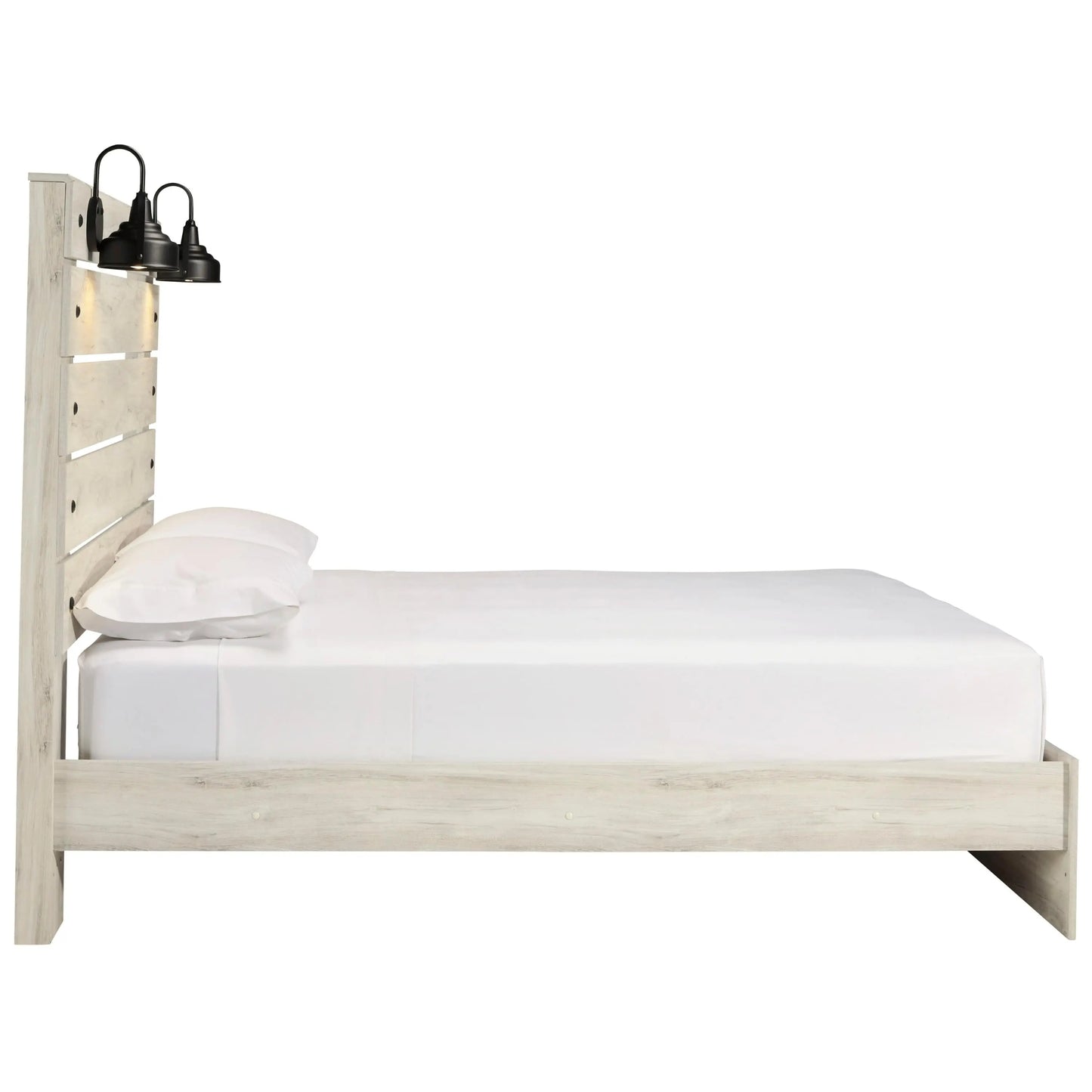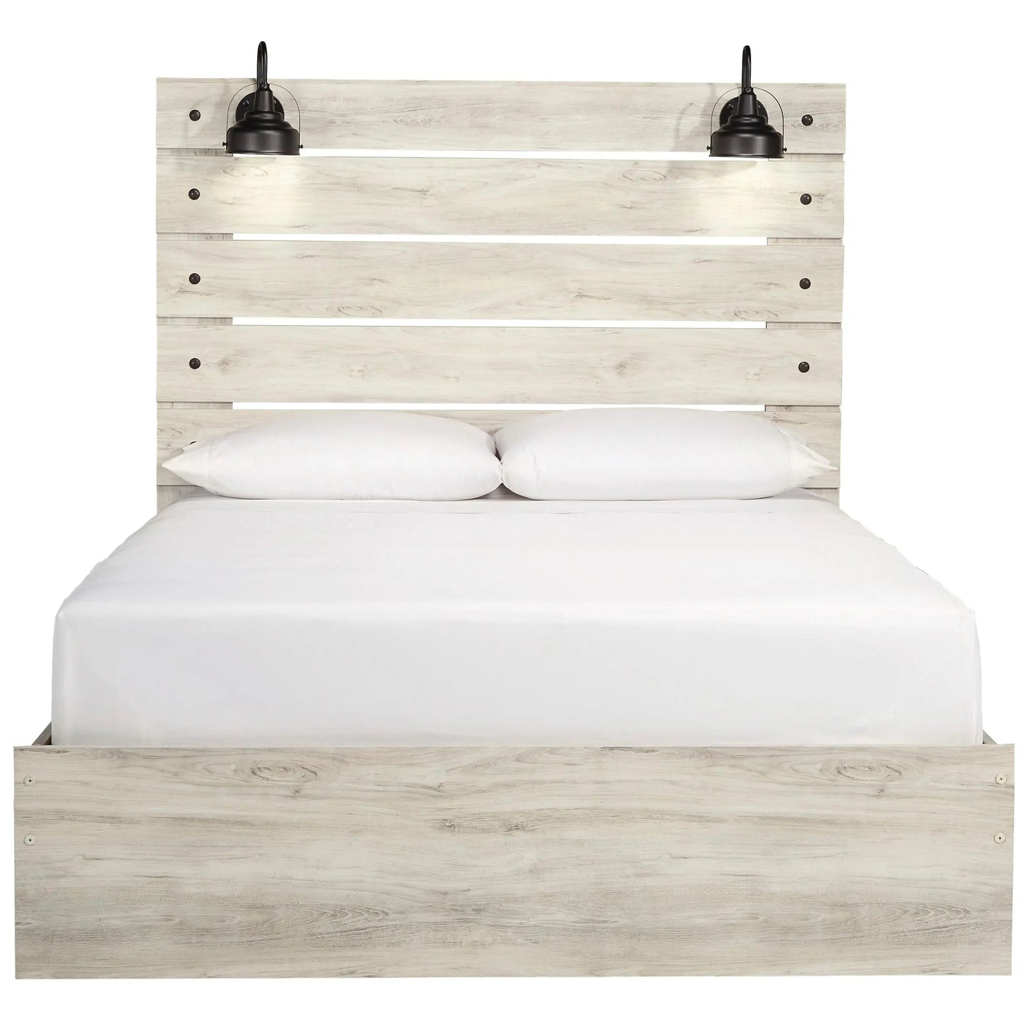 What a delightful take on rustic industrial style. Whether modern loft or modern farmhouse, this queen panel bed makes itself at home. The wispy whitewash palette enhances without covering the grain for that weathered look you crave. Love to read in bed? You’re sure to find the retro-chic light sconces and USB plug-ins on the open-slat style headboard such a bright idea.