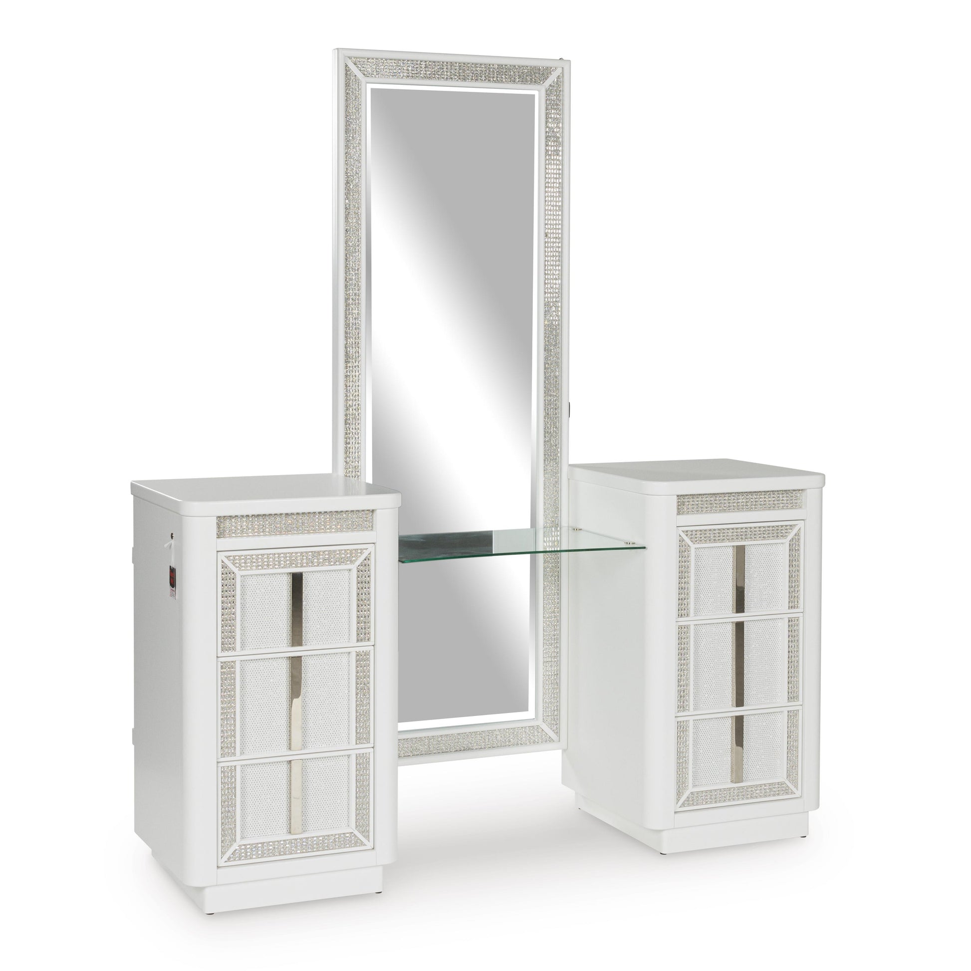 Transform your bedroom with this chic vanity and mirror. Its modern design and glamorous details create a sophisticated retreat. The built-in LED lighting and rhinestone-framed drawers and mirror add style and practical storage while reflecting elegance. Let your sanctuary shine—and never let anyone dull your sparkle.