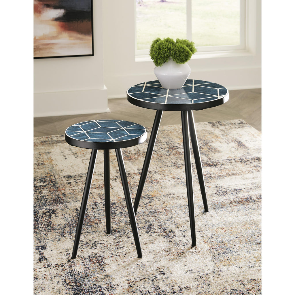 This accent table set enamors all with its striking style. The mesmerizing diamond pattern top graces your space with a splash of geometric design and a dashing two-tone teal glaze. Dazzle guests by making it a resting place for cocktails and hors d'oeuvres at parties—or keep this piece all to yourself as a bedside table for books and other baubles.