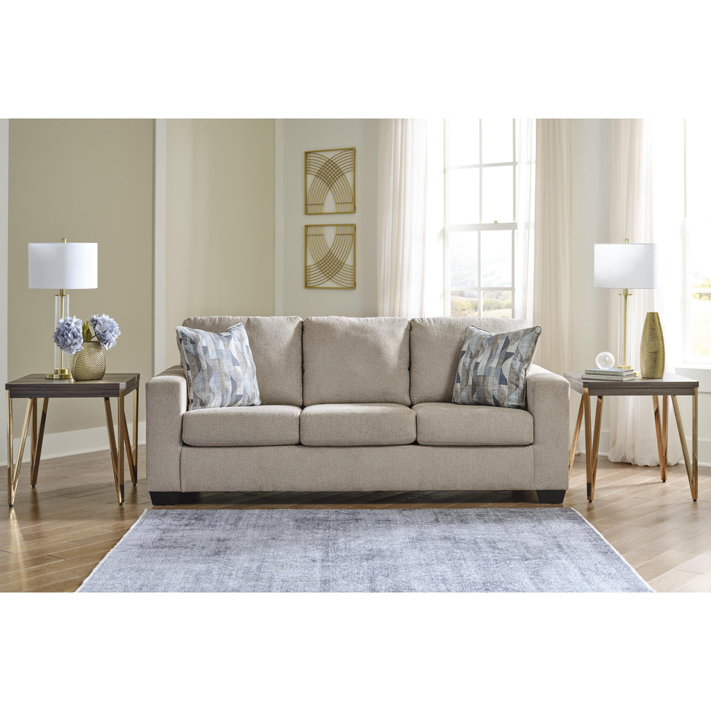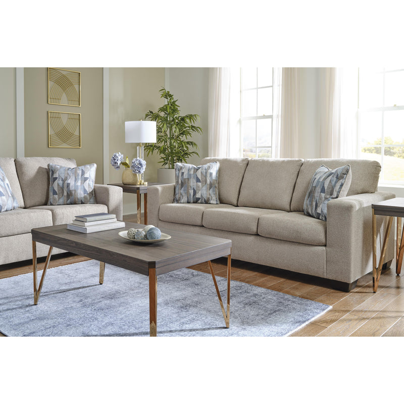 You’re in for a neat treat with this sofa. Its comfy seats are covered in soft, textural upholstery, and the wide track arms are eager to support your quest for total relaxation. Distressed abstract toss pillows bring a fresh breath of contemporary style while accentuating the sofa's color.