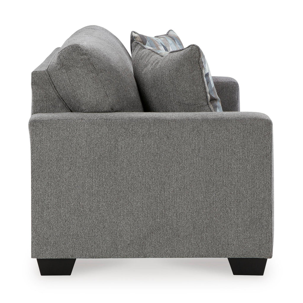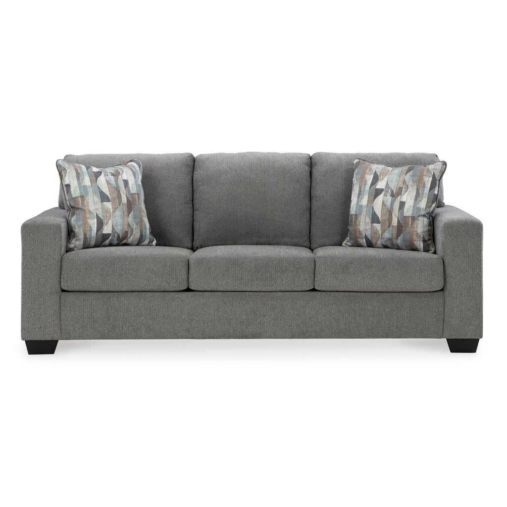 You’re in for a neat treat with this sofa. Its comfy seats are covered in soft, textural upholstery, and the wide track arms are eager to support your quest for total relaxation. Distressed abstract toss pillows bring a fresh breath of contemporary style while accentuating the sofa's color.