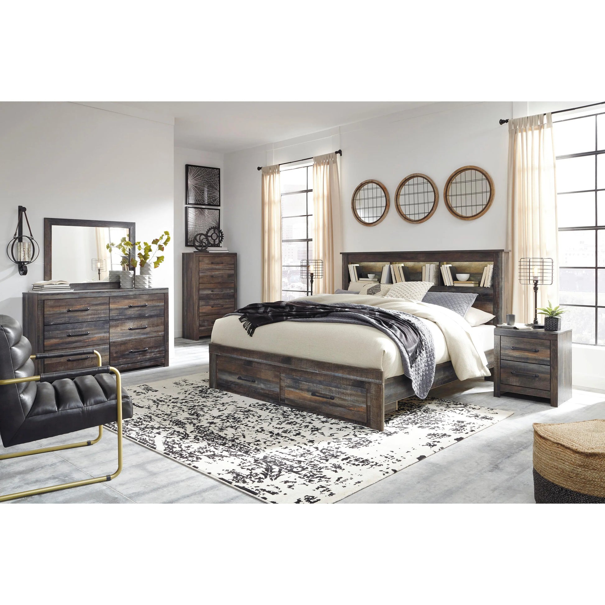 When merged in just the right way, rustic and industrial styles can make one happy marriage. Case in point: this king bookcase bed with storage. A refined take on barn board beauty, its complex, replicated wood grain showcases hints of burnt orange and teal tones for a sense of weatherworn authenticity. Three open cubbies lined with a dimming LED light strip keep bedtime reads top of mind. Double drawers at the foot of the bed come in mighty handy.